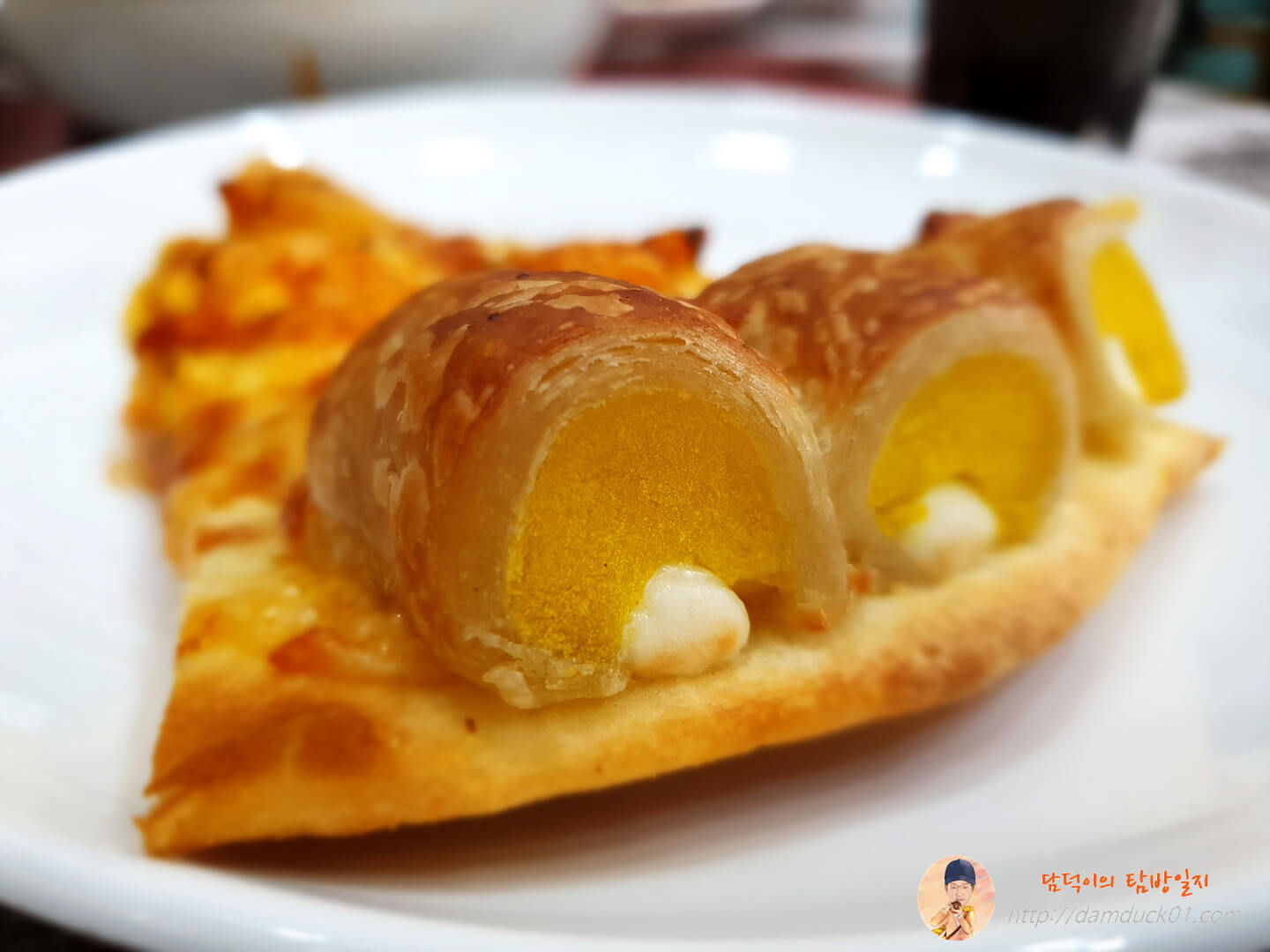 통새우 바이트 피자의 바이트는 치즈와 함께 고구마 무스로 가득 채워져 있어요.