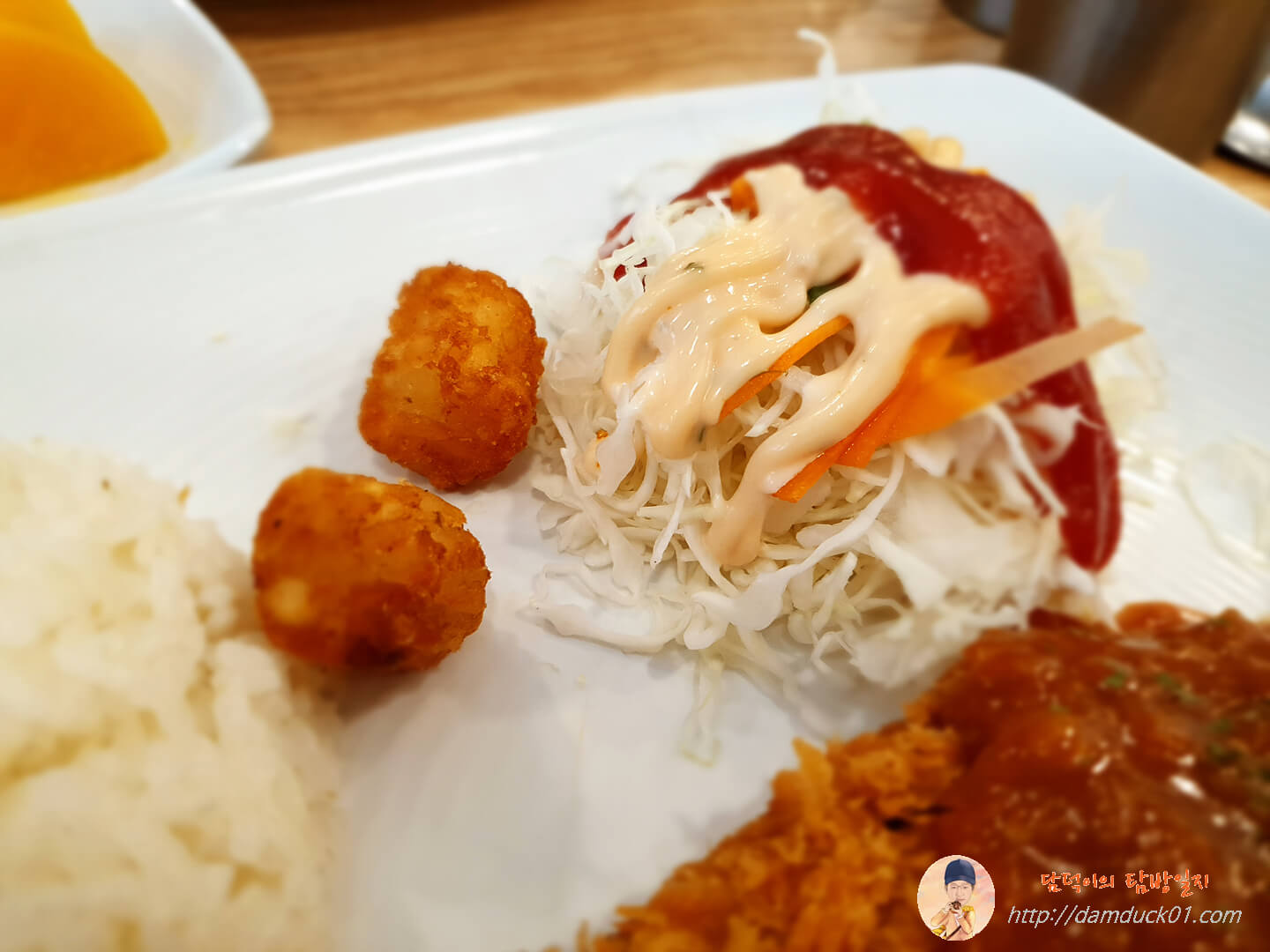 밥 한 덩이랑 해쉬 브라운 두 개, 양배추 샐러드와 치즈돈가스까지.