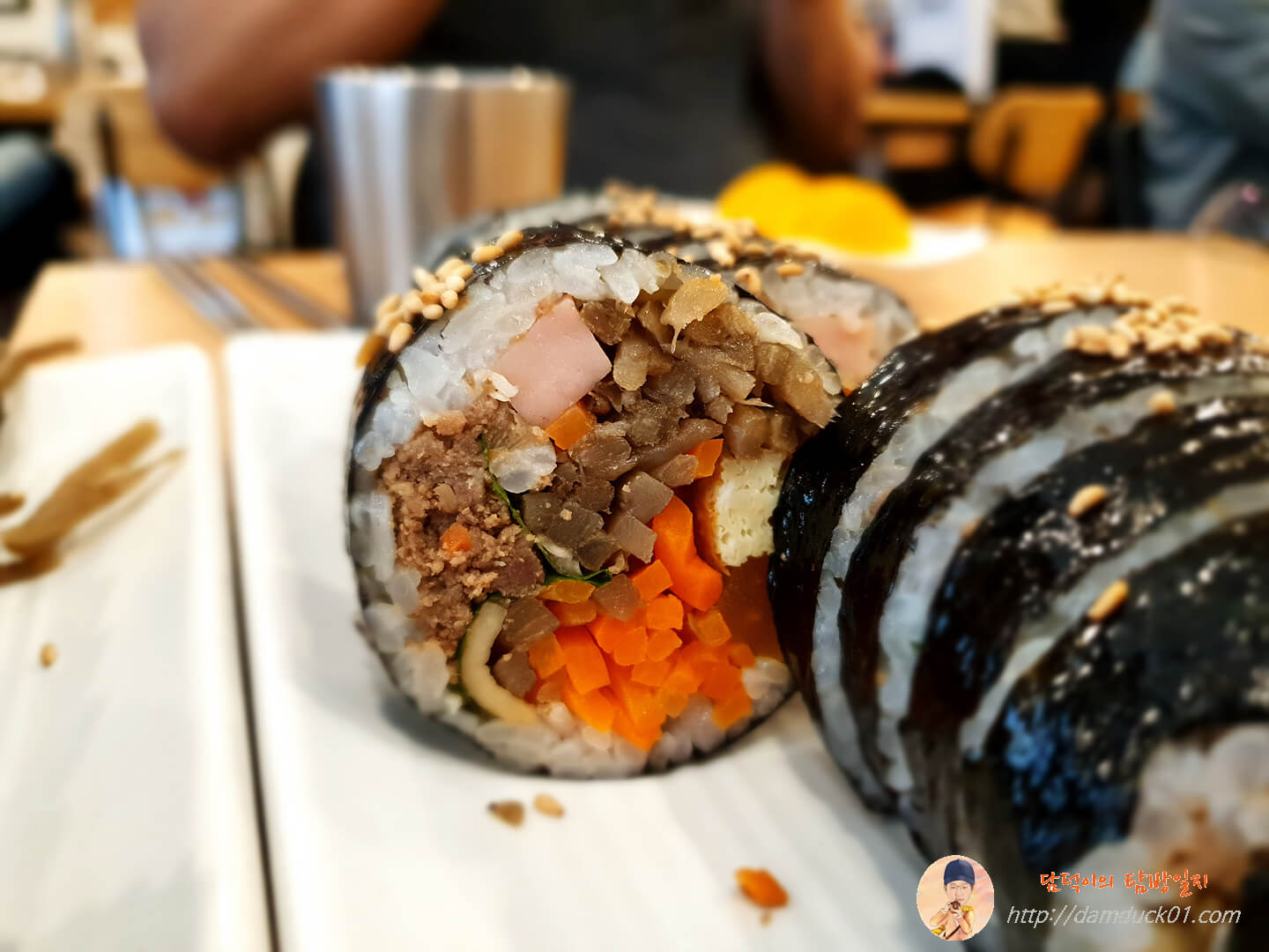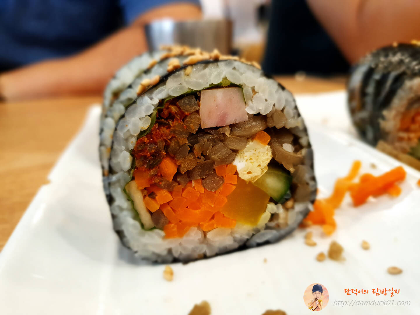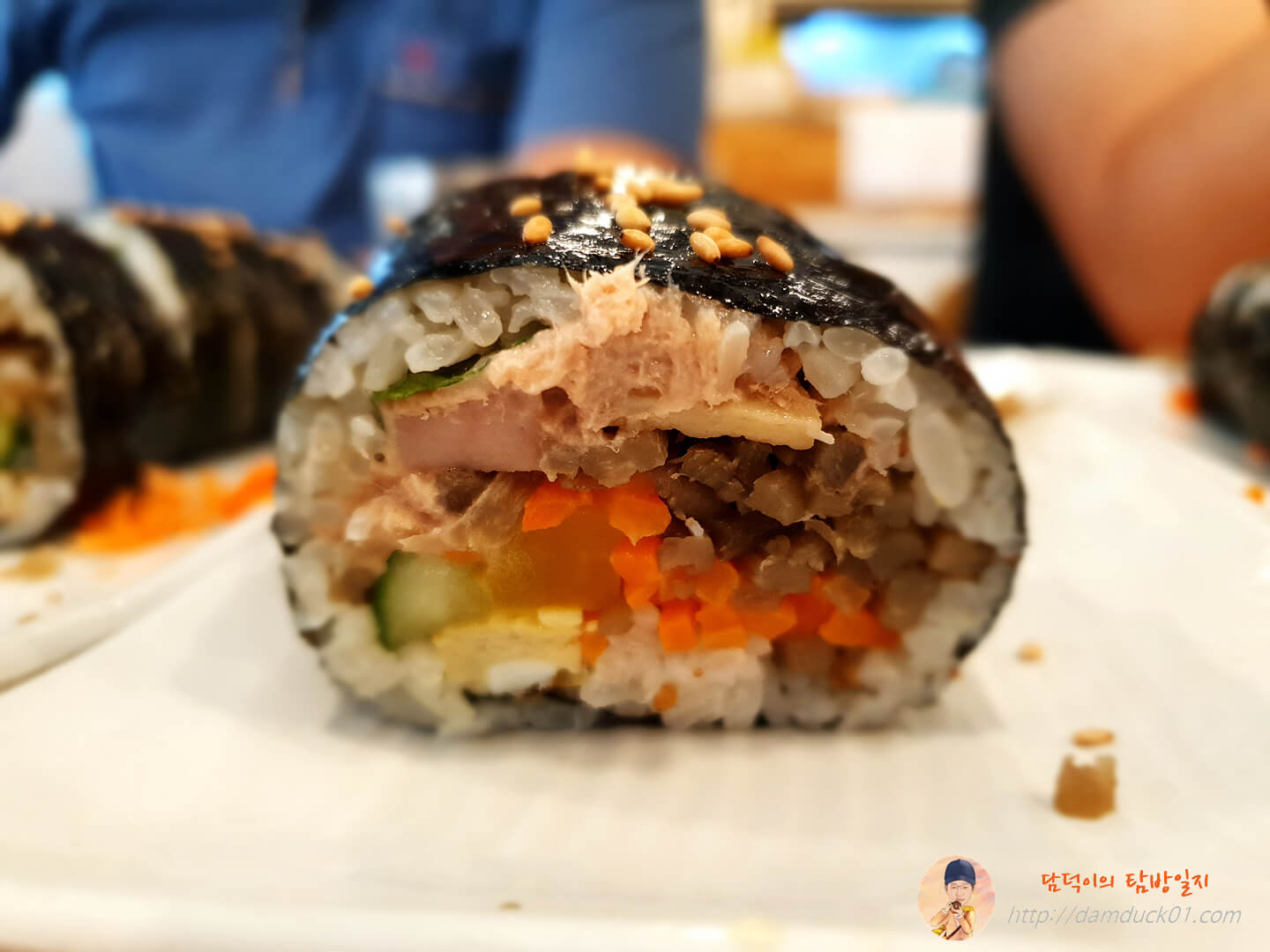 두께 두껍고 속 재료 넘쳐나는 데다가 기름을 발라 반들반들한 김 그리고 그 위에 뿌려진 깨까지.