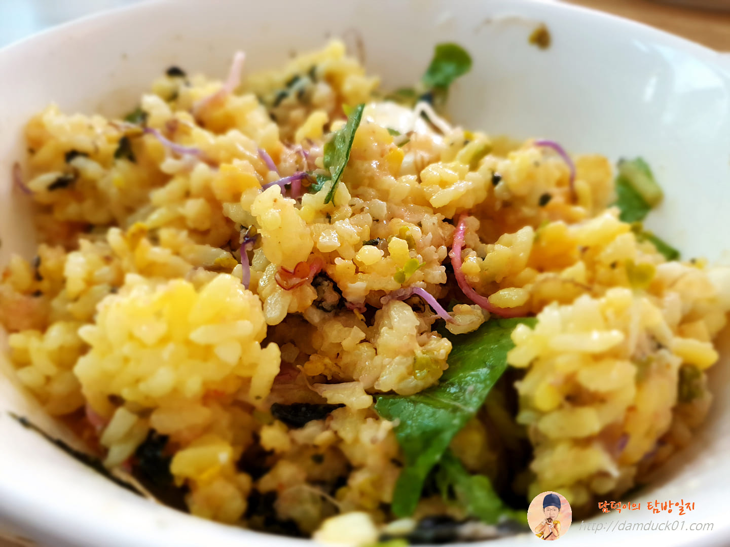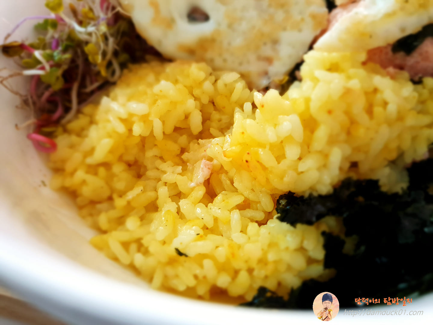 위에 얹어져 있는 재료들을 걷어내고 속을 보면 이렇게 노란색의 강황 밥이 깔려 있는 걸 볼 수 있어요.