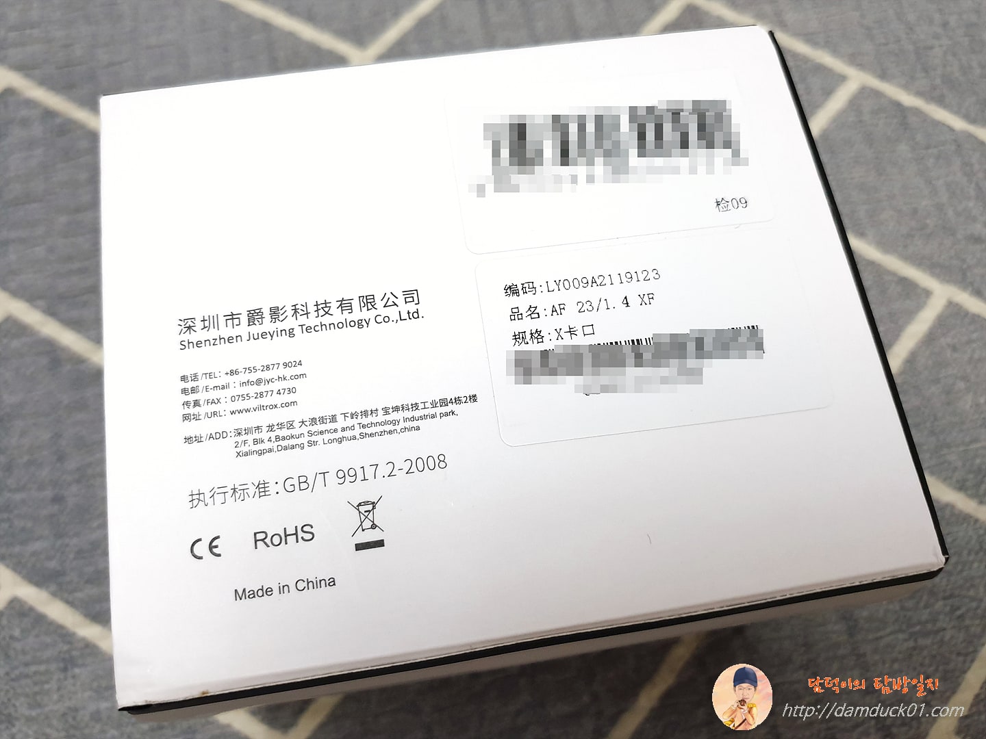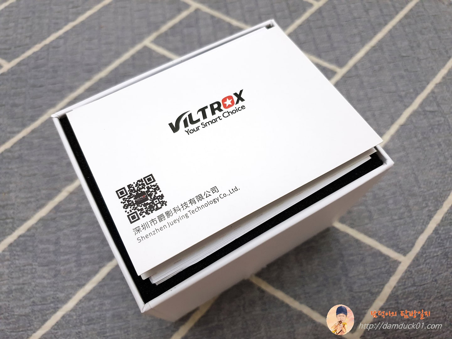 상자 위에는 VILTROX 로고만 인쇄되어 있고 측면에는 제품 이미지와 명칭이 두 면에 인쇄되어 있어요. 하단에는 제품에 대한 특징이 중국어로 적혀 있습니다. 뭔 말인지 모르겠으니 그냥 Pass~