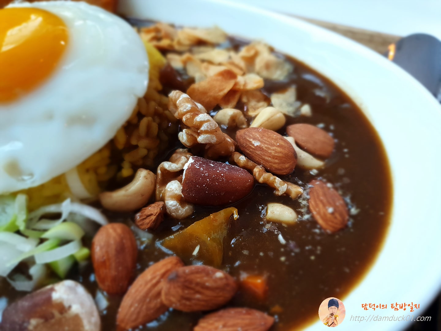 카레에 다양한 견과류가 카레 그릇 한쪽을 가득 채웠습니다.