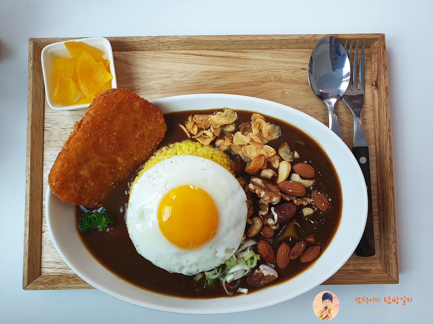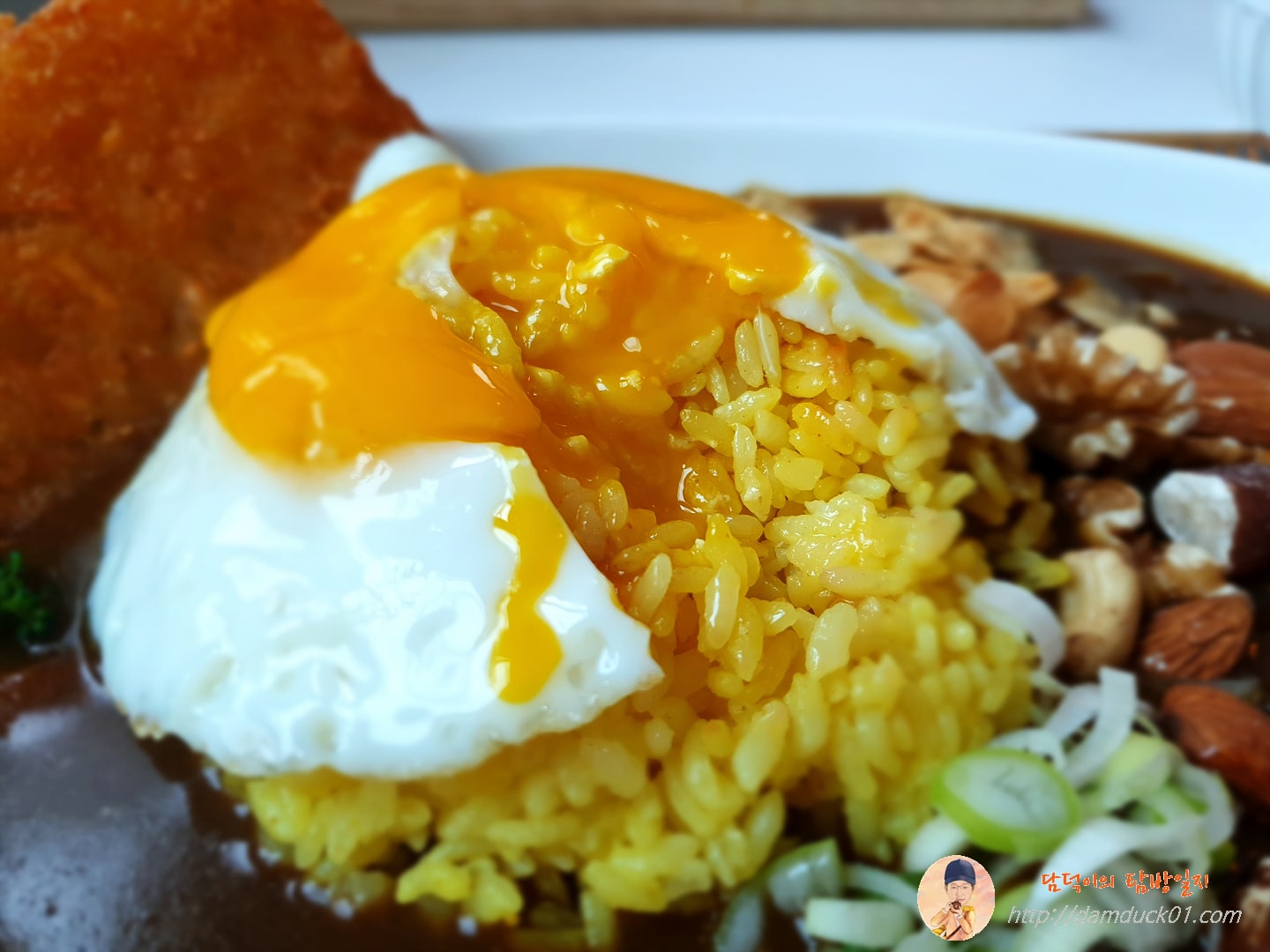 반숙으로 나온 달걀 프라이는 노른자를 톡 터트려서 노른자가 밥에 흘러내리도록 해서 강황 밥에 슥슥 고르게 발라주고 카레와 견과류를 한 숟가락에 가득 떠서 입에 넣고 단무지 하나 해시브라운 한 조각 더 넣어주면 이게 맛있습니다.