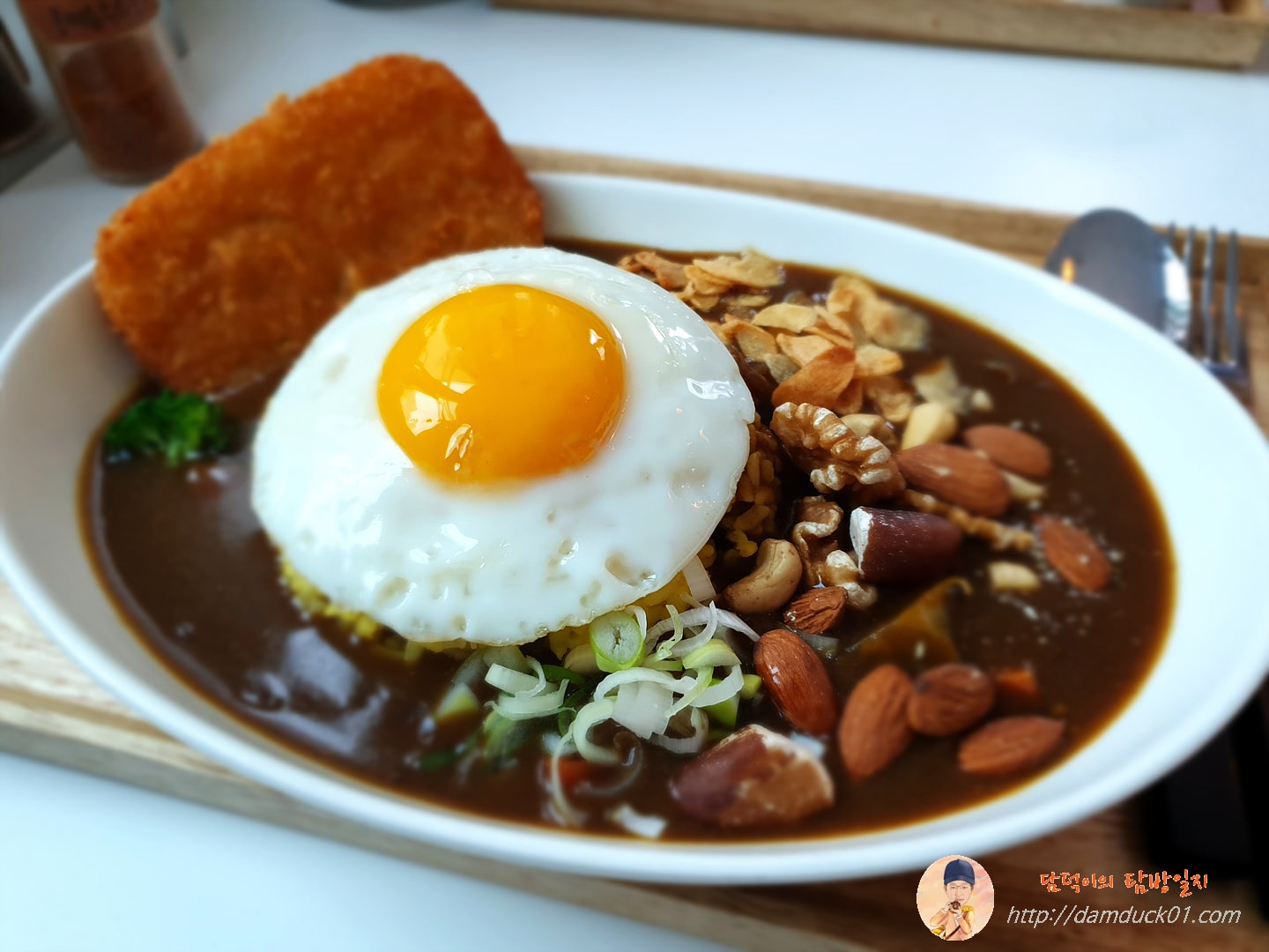 반숙으로 나온 달걀 프라이는 노른자를 톡 터트려서 노른자가 밥에 흘러내리도록 해서 강황 밥에 슥슥 고르게 발라주고 카레와 견과류를 한 숟가락에 가득 떠서 입에 넣고 단무지 하나 해시브라운 한 조각 더 넣어주면 이게 맛있습니다.