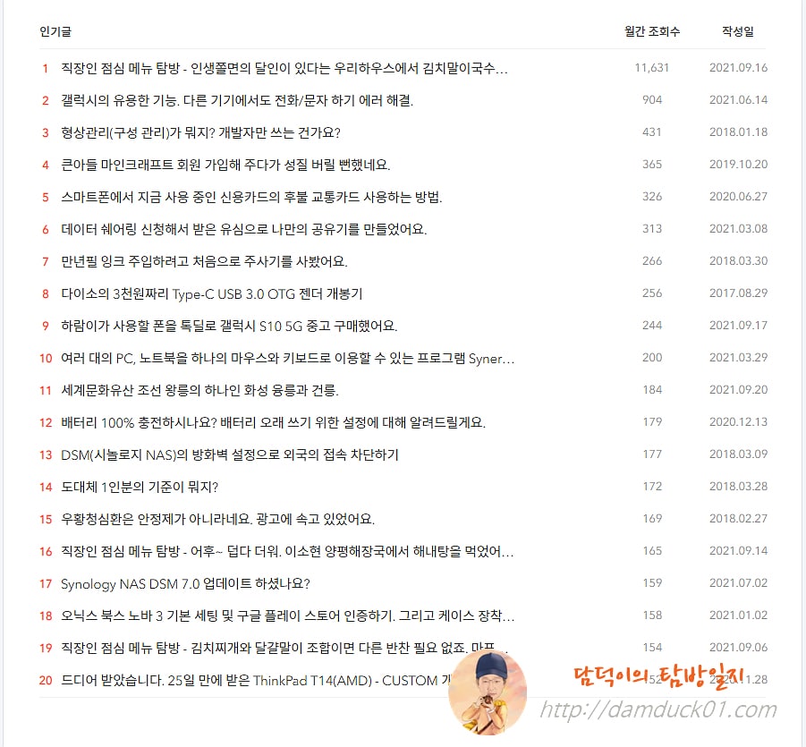 그럼 인기 글 TOP 20을 통해 2021년 9월 담덕이의 탐방일지를 하드캐리한 다음 메인 등록 글이 뭔지 알려 드릴게요. 당연히 2021년 9월의 인기 글 1위 글이 바로 다음 메인 등록 글이겠죠. 2021년 9월 16일에 발행된 "직장인 점심 메뉴 탐방 - 인생쫄면의 달인이 있다는 우리하우스에서 김치말이국수와 쫄면 먹고 왔어요." 글이 발행 당일에 다음 메인에 등록되면서 약 3일간 다음에 노출되었는데요.