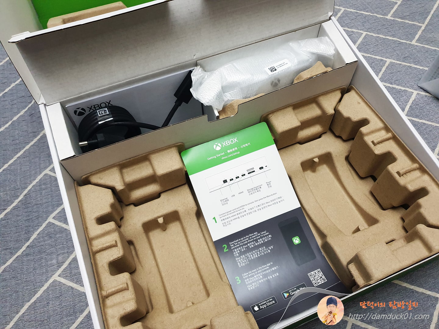 Xbox Series S 본체를 들어내면 이렇게 하단에 간단 사용 설명서가 들어 있고 상단에 있는 별도의 종이 상자에 구성품이 들어 있습니다.