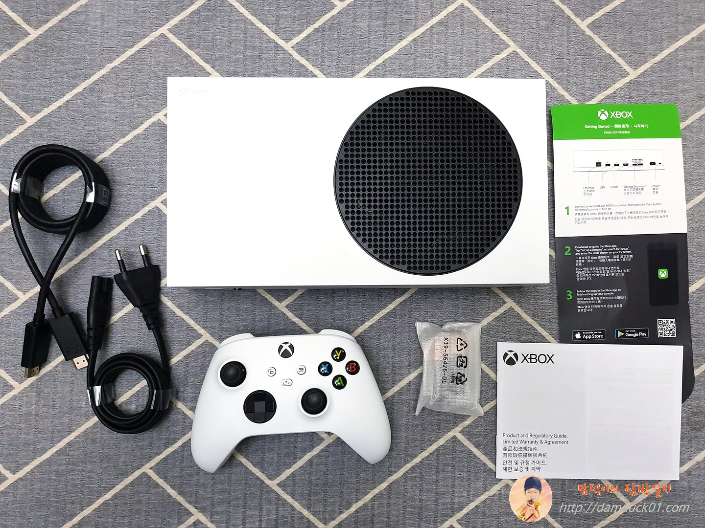 전체 구성품을 살펴보면 이렇게 되어 있습니다. Xbox Series S 본체와 전원 케이블, TV나 모니터와 연결할 HDMI 케이블, 연결 가이드와 제한 보증 및 규약 안내서, 그리고 함께 제공되는 하나의 컨트롤러에는 AAA 건전지 한 쌍도 함께 동봉되어 있습니다.
