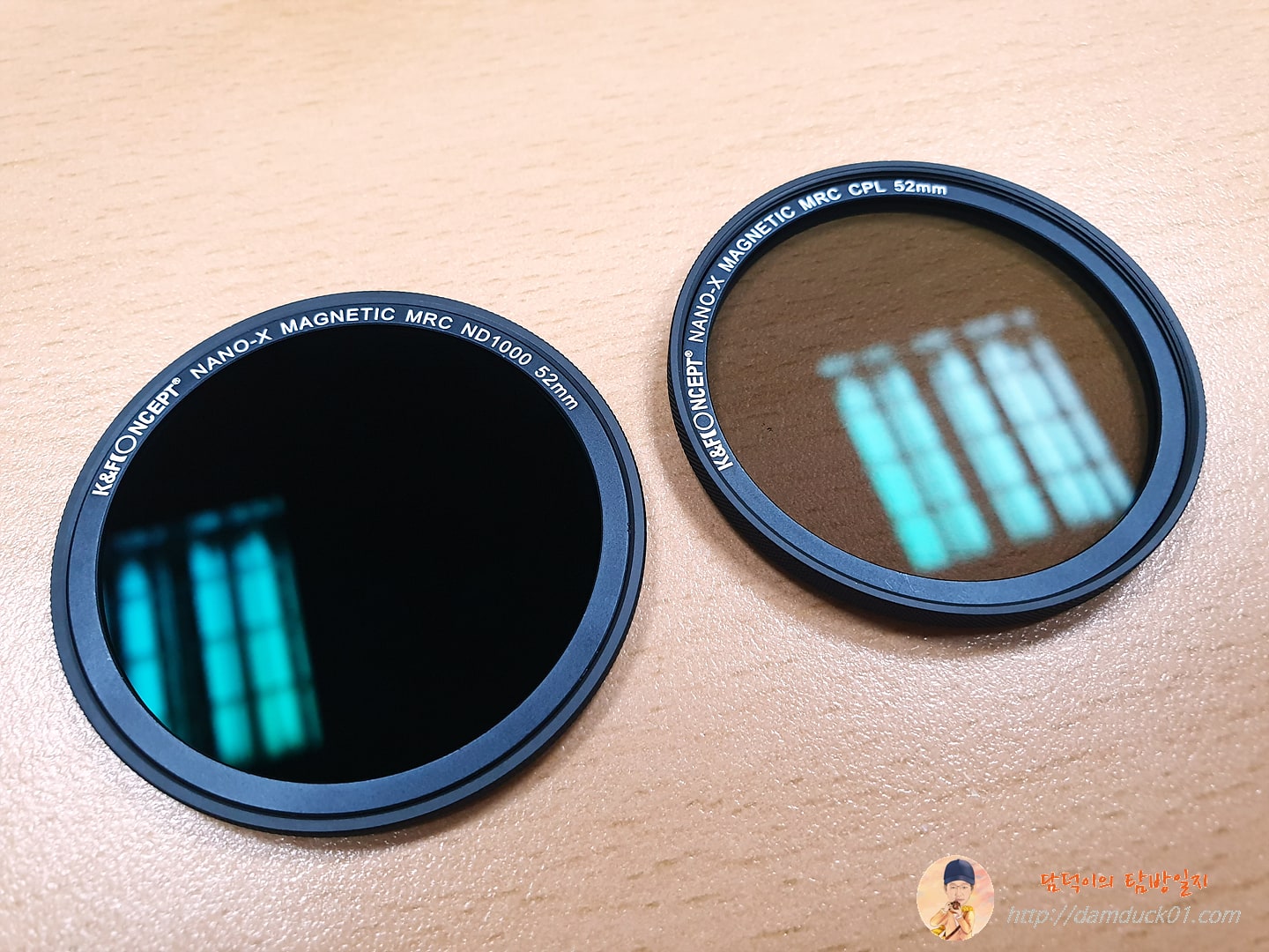 실제로는 처음 보는 ND 필터와 CPL 필터인데요. 제가 아는 대로 간단히 설명하자면 ND 필터는 선글라스라고 생각하면 됩니다. 빛이 너무 밝은데 강제로 어둡게 해서 셔터 속도를 높이고자 할 때 렌즈 앞에 붙여서 사용하고 CPL 필터는 편광필터라고 하는데 유리, 수면 등의 표면에 생기는 반사광을 제거해 주는 역할을 합니다. CPL 필터를 이용해서 수면이나 유리창을 투명하게 촬영하는 게 가능해지죠.