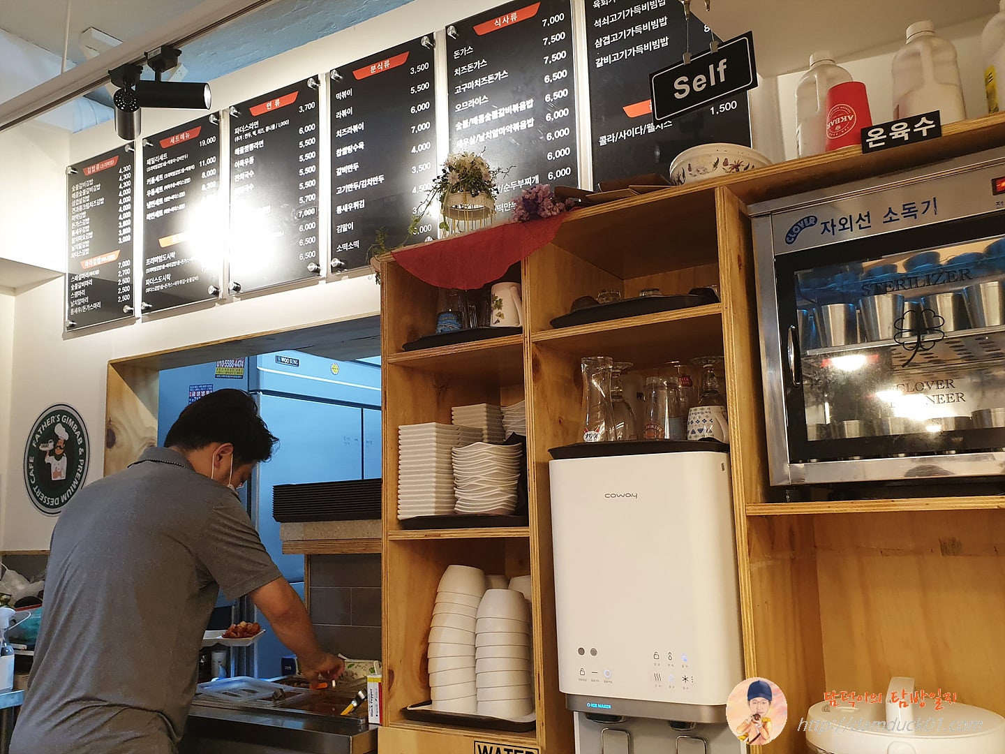 저는 물통이랑 반찬이 가까운 주방 앞 쪽에 자리를 잡았습니다. 솔직히 이 자리가 제일 편하지 않아요? 요즘 다 셀프인데 반찬 가져오기도 물 가져오기도 그리고 다 먹고 나갈 때 퇴식대도 가까워서 저는 이런 자리가 제일 편하더라고요.