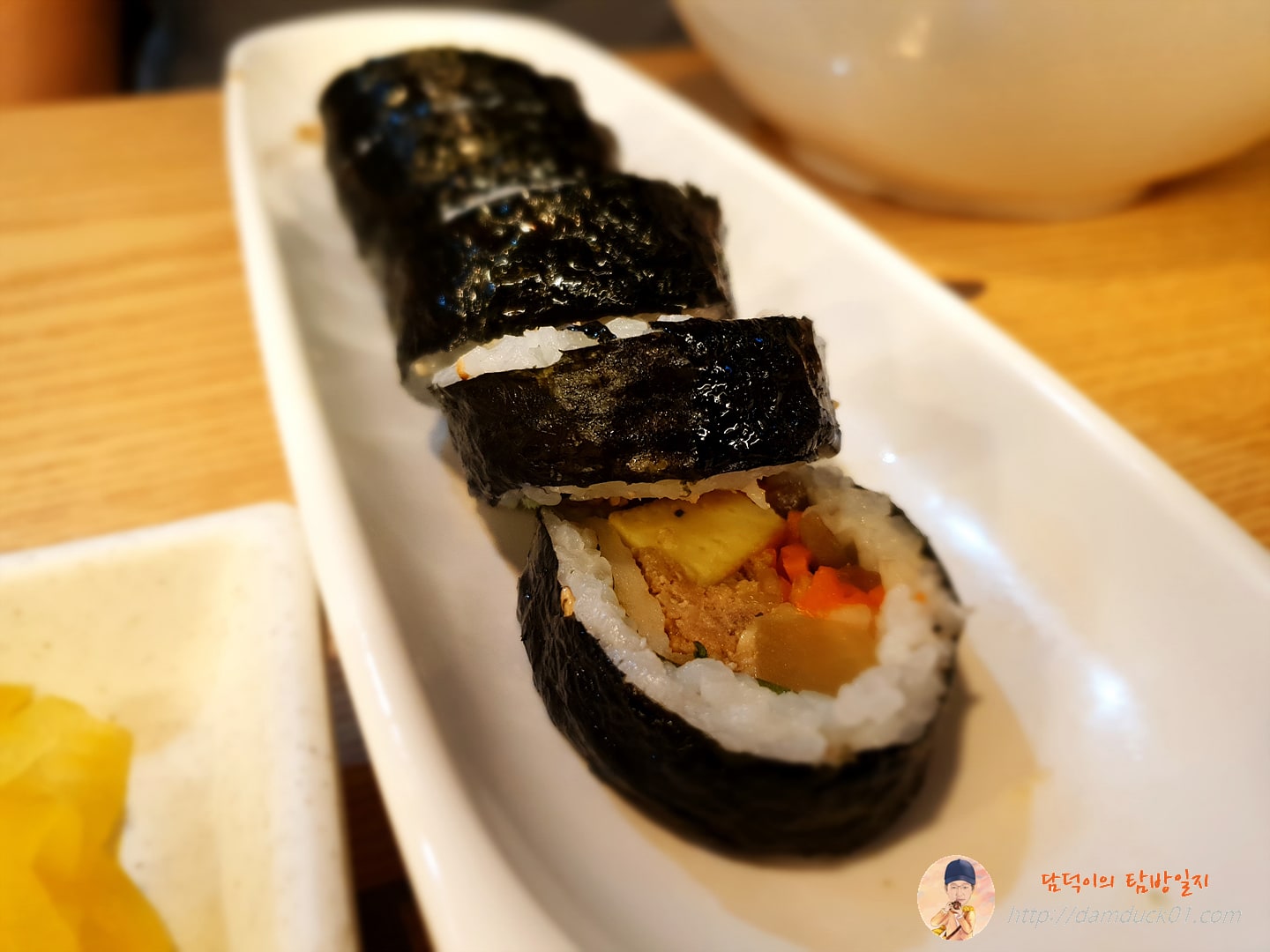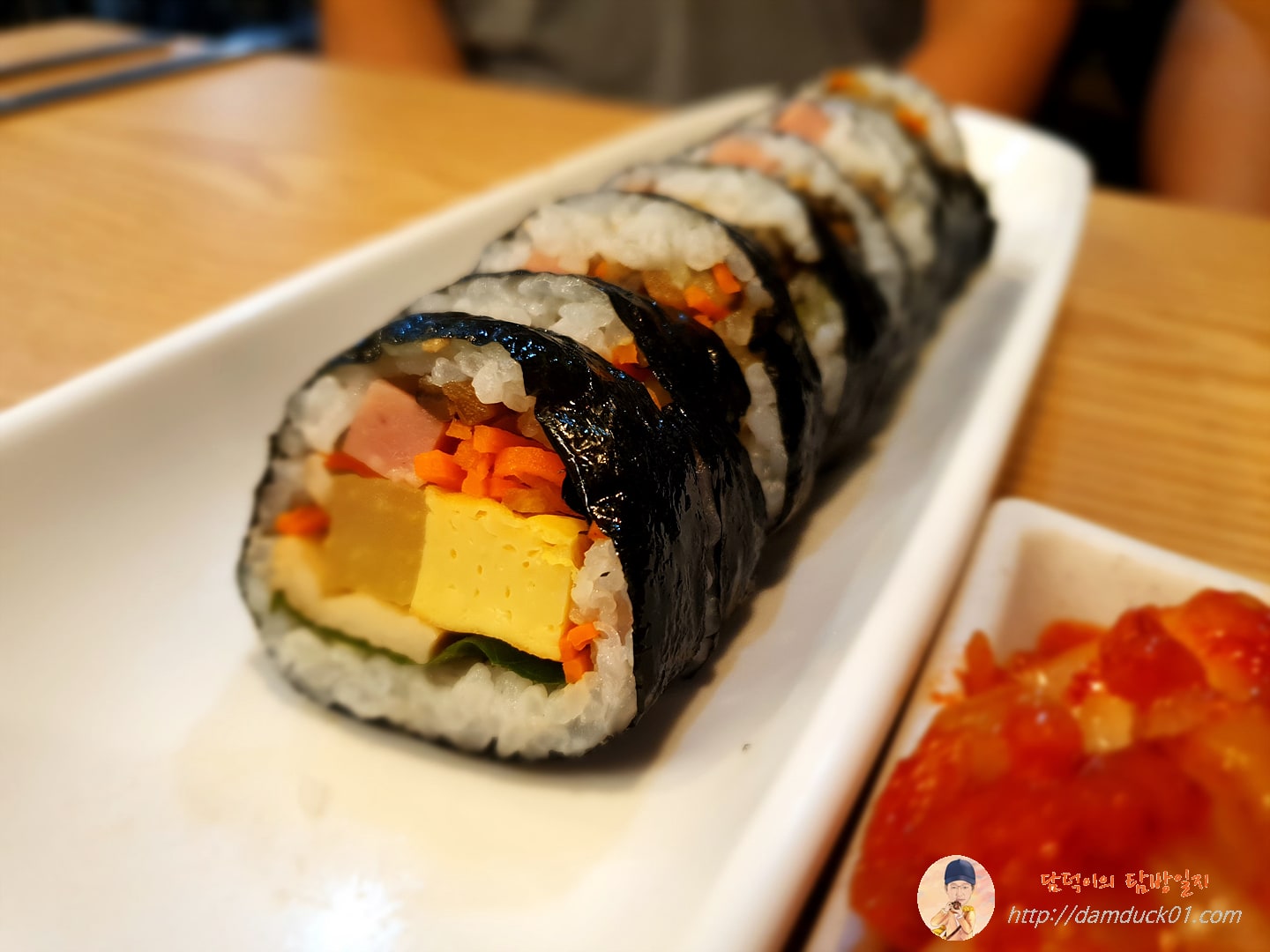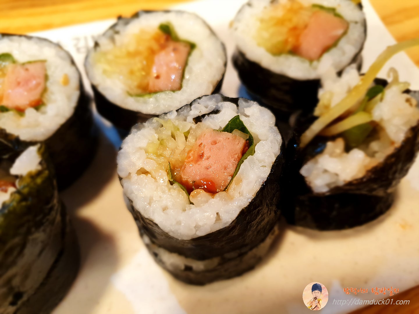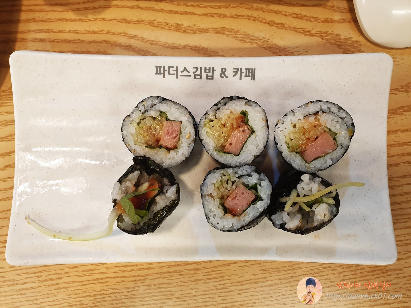 김밥도 두께가 얇은 편인데 스팸 마리는 더 얇네요. 다른 곳에서 스팸 김밥을 먹은 적이 있는데 들은 구성은 비슷하지만 다른 곳에서 먹은 스팸 김밥은 크기가 이것보다는 훨씬 컸거든요. 음~ 파더스김밥&카페에서 말하는 김밥과 마리의 차이가 뭔지는 모르겠지만 그냥 김밥 드세요. 김밥 맛은 괜찮습니다.