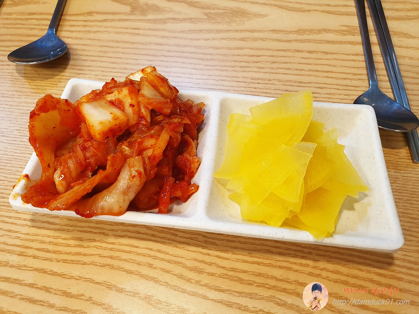 셀프로 가져온 반찬은 배추김치와 단무지, 분식집 반찬이 이 정도면 됐죠. 뭐.