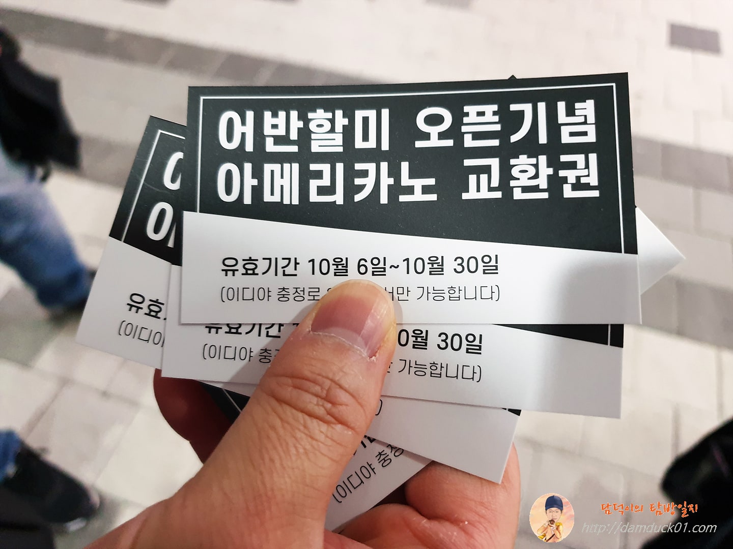 그래도 어제는 어반할미 오픈 기념 아메리카노 교환권을 받았거든요. 오픈 행사로 제공되는 거 같은데 10월 30일까지 사용 가능한 아메리카노 쿠폰입니다. 이디야의 아메리카노가 3,200원 정도니까 커피 값까지 생각하면 저렴하게 먹긴 했네요. 그런데 이건 오픈 기념 쿠폰이니까 쿠폰 행사가 끝나면 음~ 다음에 방문하게 된다면 할미 추천 메뉴를 먹어보고 리뷰 남기도록 할게요. 그럼 오늘도 행복한 하루 보내시기 바라며 이만 Bye~