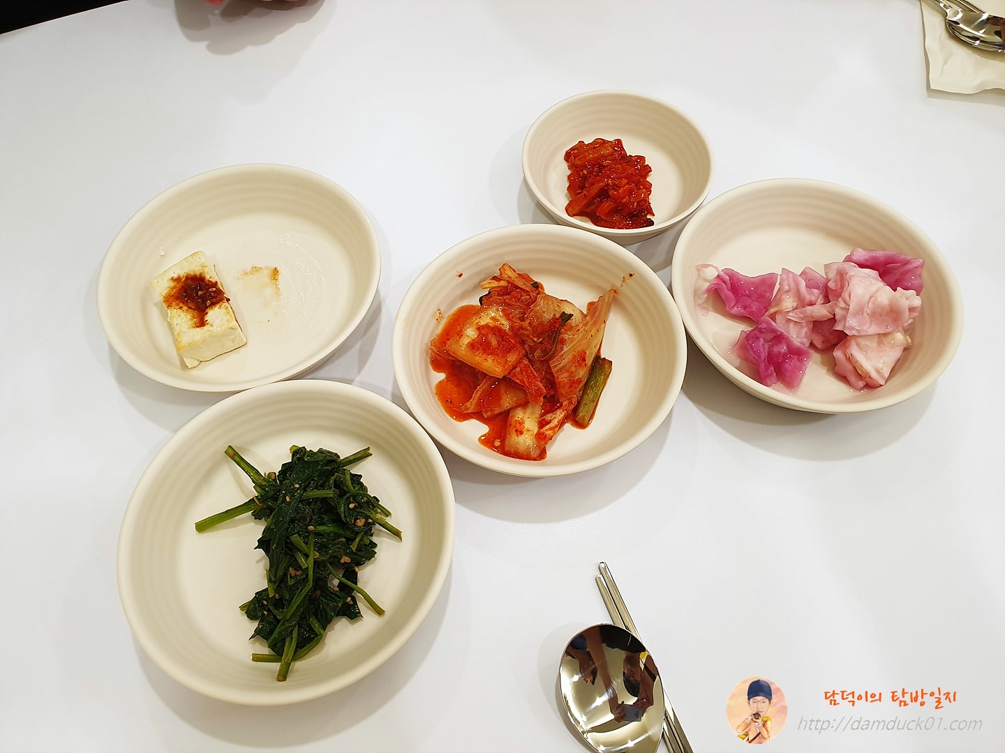 기본 반찬은 5가지로 두부구이랑 나물 한 종류, 배추김치와 오징어젓갈 그리고 양배추 피클까지, 주문을 하고 음식이 나오는데 시간이 꽤 걸렸어요. 원래는 계산대 앞 쪽에 키오스크가 있는 걸 보니 키오스크로 선주문에 결제까지 하는 시스템인 거 같은데 아직 개통이 안 되어있는지 키오스크가 꺼져 있고 직접 주문을 받는 방식인데 음~ 손님이 조금 있는 편이긴 했지만 홀에 2명, 주방에 2~3명 정도가 있었던 거 같은데 이 정도면 정신없이 바쁠 정도는 아닐 거라고 생각했는데 손님 입장에서 바쁘고 정신없다는 게 느껴질 정도였어요.