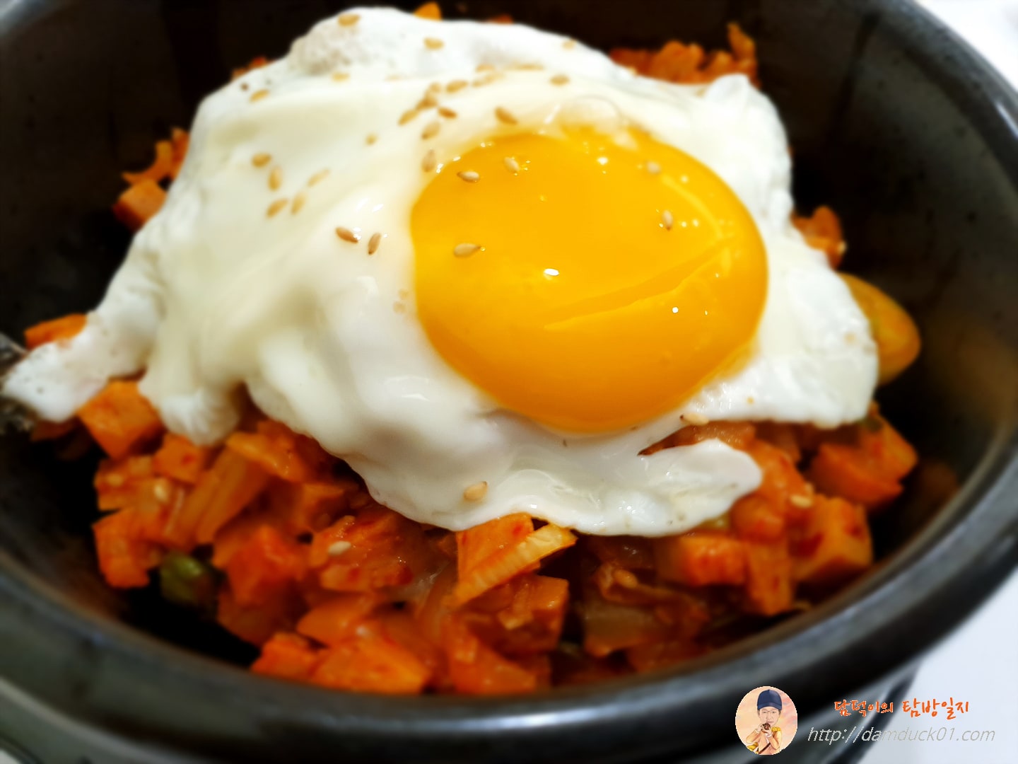 노른자를 톡 터트려서 흘러내리는 노른자를 골고루 흩트려줍니다. 그리고는 슥슥, 삭삭 빠르게, 뚝배기에 담겨 나와서 사진 찍고 하는 사이에 바닥에 밥이 살짝 눌어붙었는데 깔끔하게 그리고 빠르게 비벼줍니다. 그럼 이렇게 스팸 김치 비빔밥이 완성입니다. 왜 덮밥이라는 표현을 썼는지 모르겠어요. 이건 비빔밥이나 볶음밥이 맞지 않을까요? 아무튼 이렇게 비벼진 스팸김치돌솥덮밥은 비주얼은 맛있어 보입니다.
