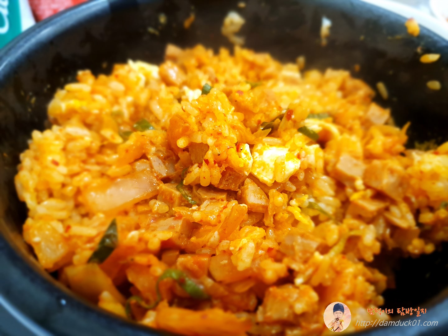 그렇게 주문 확인 후 곧바로 제 점심 메뉴인 스팸김치돌솥덮밥이 나왔는데요. 오잉! 그릇이 뚝배기일 뿐 저도 예전에 종종 만들어 먹던 비주얼의 메뉴가 나왔습니다. 전 스팸김치돌솥덮밥이라고 해서 스팸을 네모 반듯하게 크게 썰어서 연어덮밥처럼 밥 위에 좌르륵 깔리고 그 위에 볶은 김치가 소복이 올라가 있지 않을까?라고 생각했는데 그게 아니고 그냥 스팸을 깍둑썰기하고 김치와 함께 볶아서 밥 위에 올려준 방식이에요.