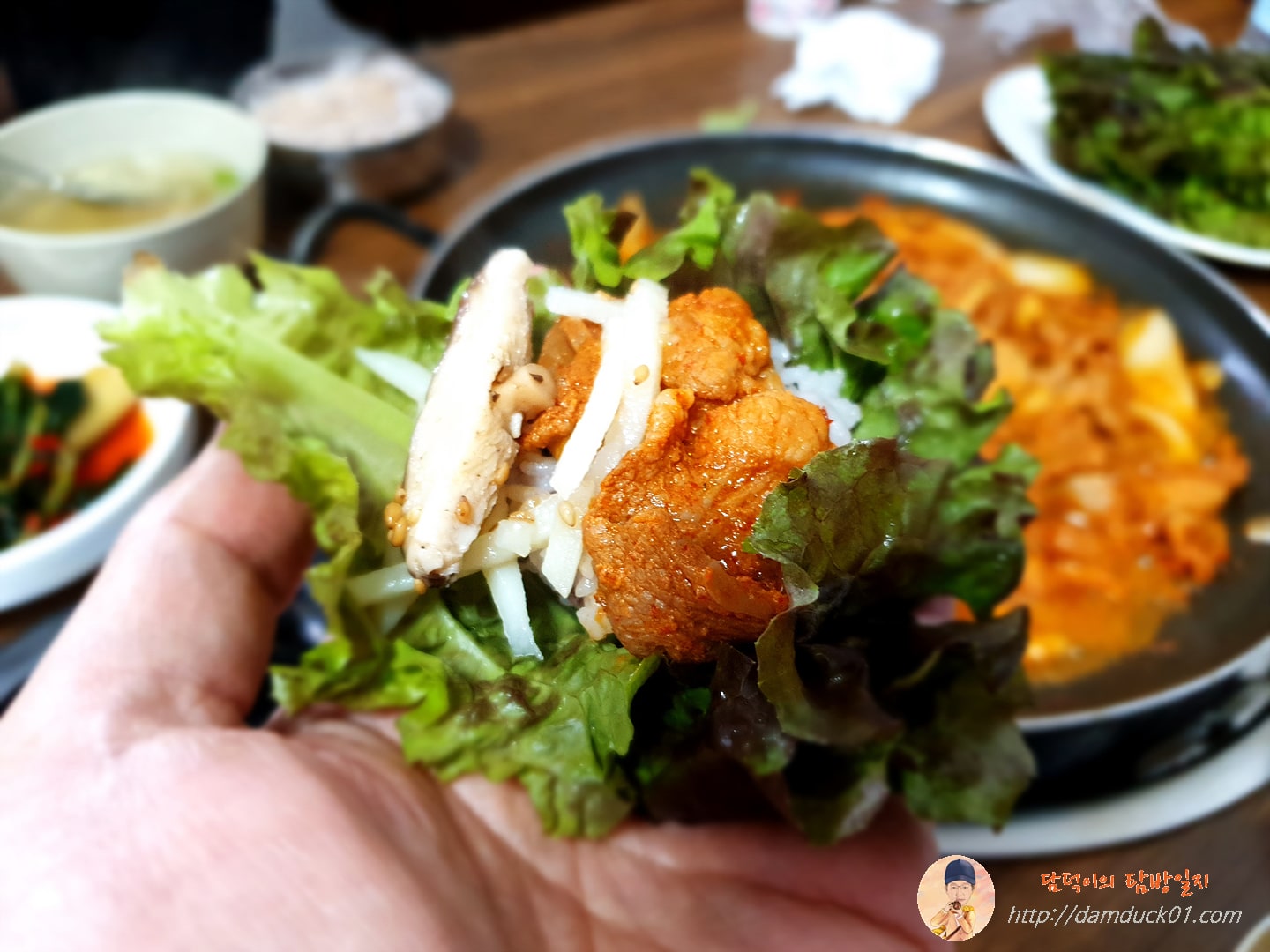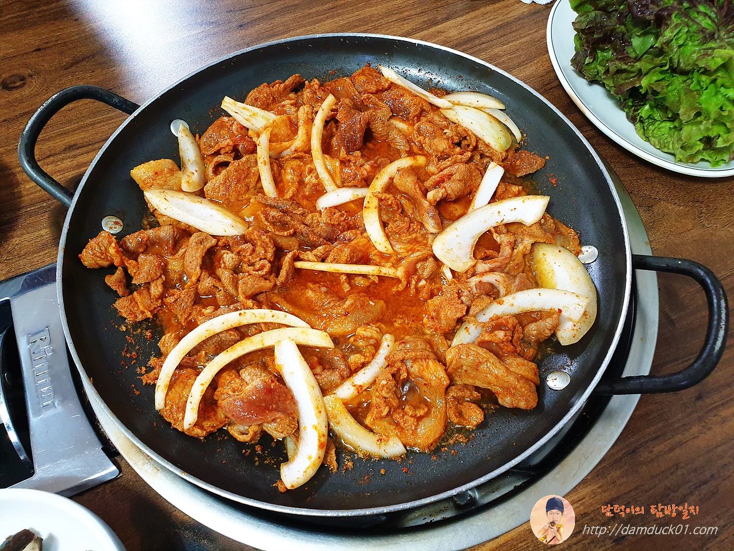 제육볶음 2인 분이 나왔습니다. 팬에 나와서 약 불에 계속 데워가면서 먹을 수 있다는 거 이게 접시에 담겨 나오는 제육볶음에 비해서 너무 큰 장점이죠.