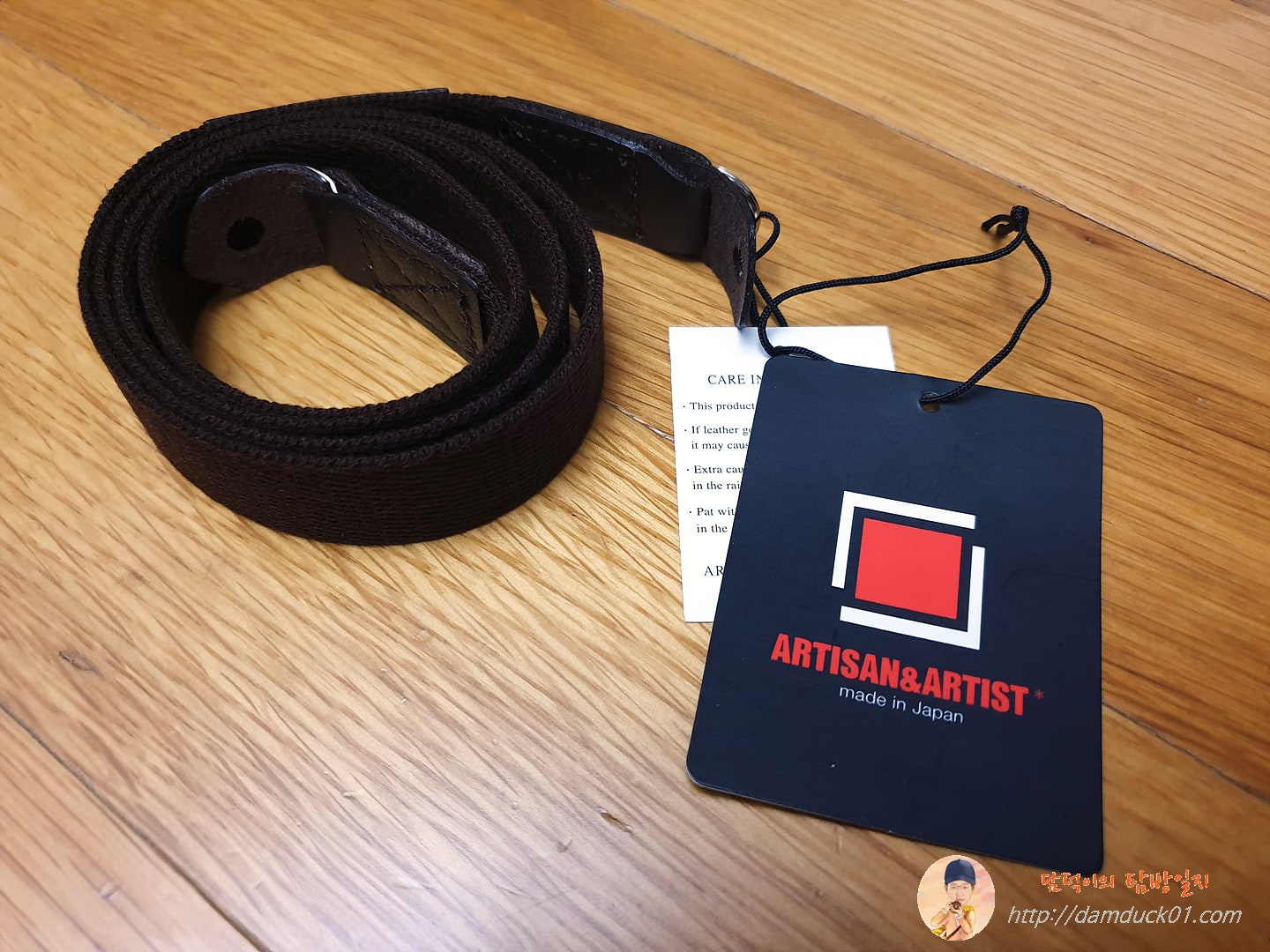 전체적으로 깔끔한 디자인을 하고 있습니다. 연결 부위의 가죽은 이전 로프 넥스트랩과 비교하면 확실히 더 두툼함이 느껴지고 스트랩의 끝 부분에 ARTISAN&ARTIST made in Japna이 인쇄되어 있는 가죽 태그가 박음질되어 있는데 브랜드에 대한 자부심이 느껴지는 디자인을 하고 있네요.