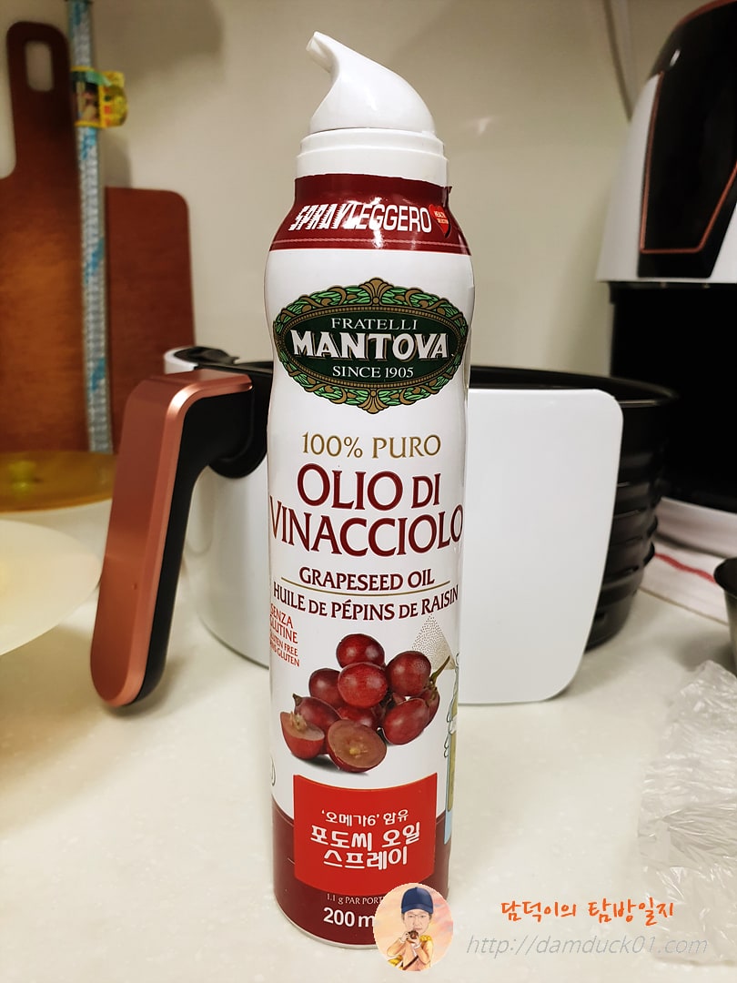 그럼 이대로 돌리느냐? 아니죠. 홈런볼과는 다른 차이점이 있는데 바로 이거, 포도씨 오일 스프레이를 뿌려줄 거예요. 우리 집에 이런 게 있다는 걸 이번에 처음 알았습니다. 아내가 기름 고르게 발라줄 때 편하다고 해서 구매했다고 하더라고요. 포도씨 오일 스프레이를 고르게 뿌려줍니다.