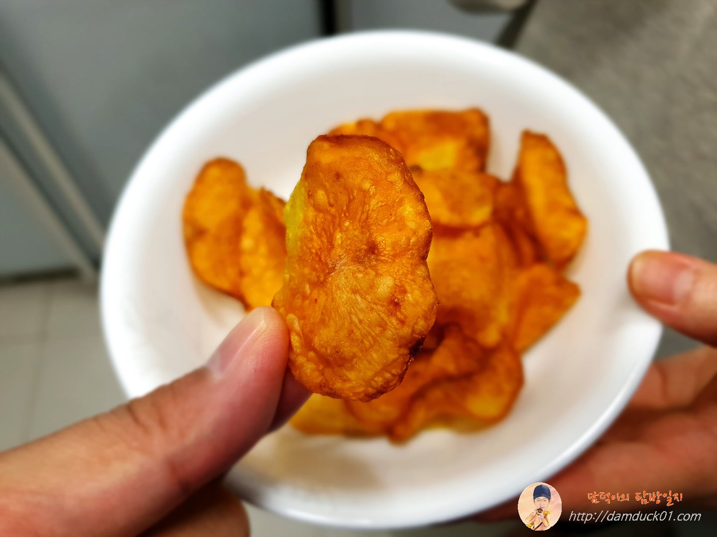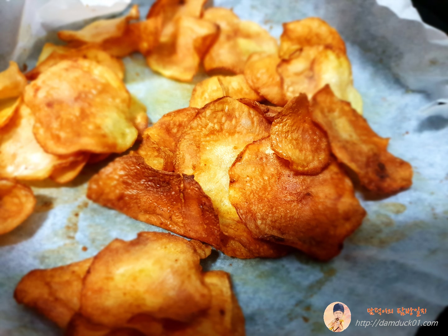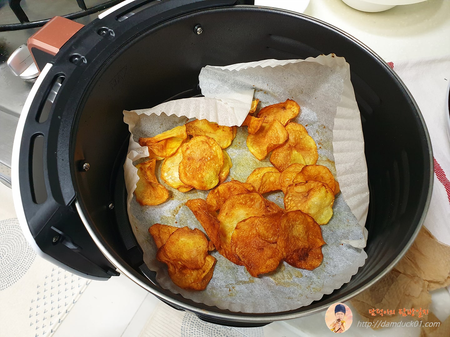 그럼 이렇게 감자칩 완성입니다. 캬~ 이 감자칩 맛납니다. 식감은 말할 것도 없고 짭조름한 맛에 너무 적은 게 아쉬울 정도였어요. 이건 에어프라이어 요리로 추천할 만합니다. 간식으로 먹기 딱 좋더라고요. 술 좋아하시면 맥주 안주로도 추천할 수 있습니다.