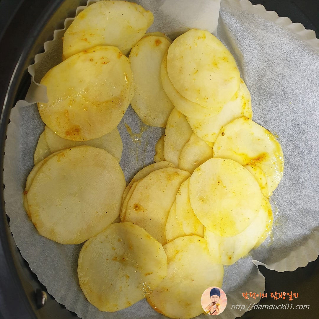 그럼 이렇게 준비가 끝난 감자를 마찬가지로 에어프라이어 바스켓에 종이호일을 깔아주고 그 위에 고르게 펴서 배치합니다. 그리고 180도로 15분을 돌려주고 뒤집어서 다시 한번 10분간 돌려줬어요.