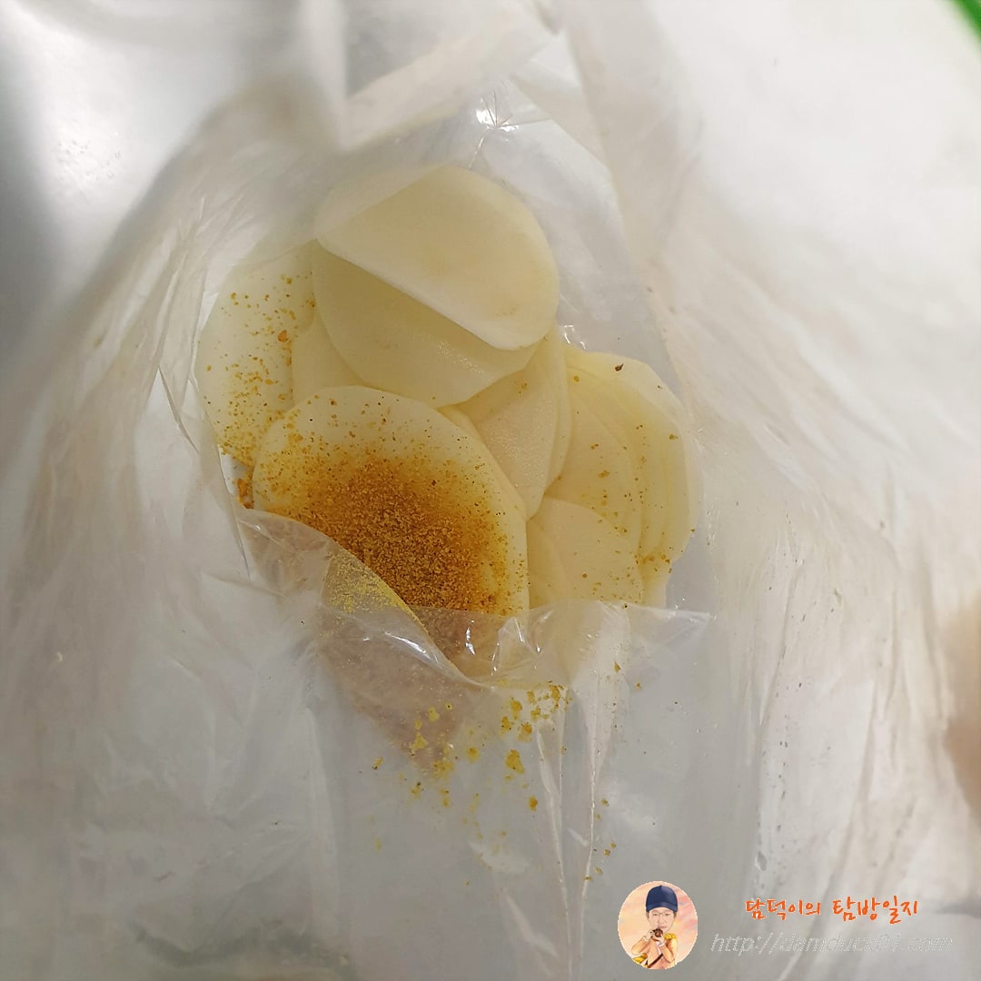 준비가 끝난 감자에 집에 있던 카레 소금을 넣고 고르게 묻혀 줍니다. 고르게 묻히기 위해 아내가 선택한 방법은 바로 지퍼백.