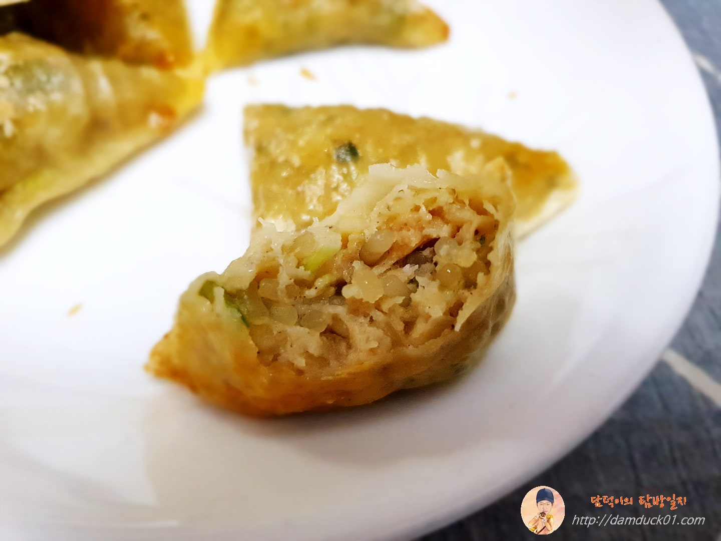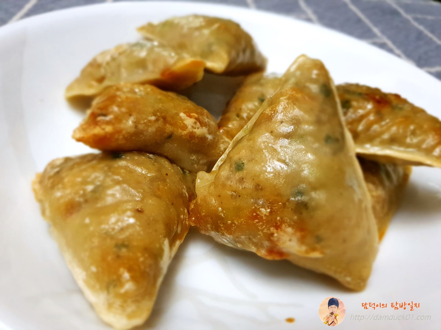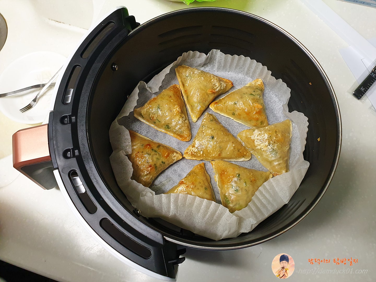 10분 후 만나게 된 얄피 세모 고기만두입니다. 오~ 확실히 전에 전자레인지에 돌렸던 것과는 비주얼 면에서 차이가 확 나네요. 뜨거운 바람으로 튀긴다는 에어프라이어의 특징을 확실히 느낄 수 있는 비주얼을 보여줍니다.
