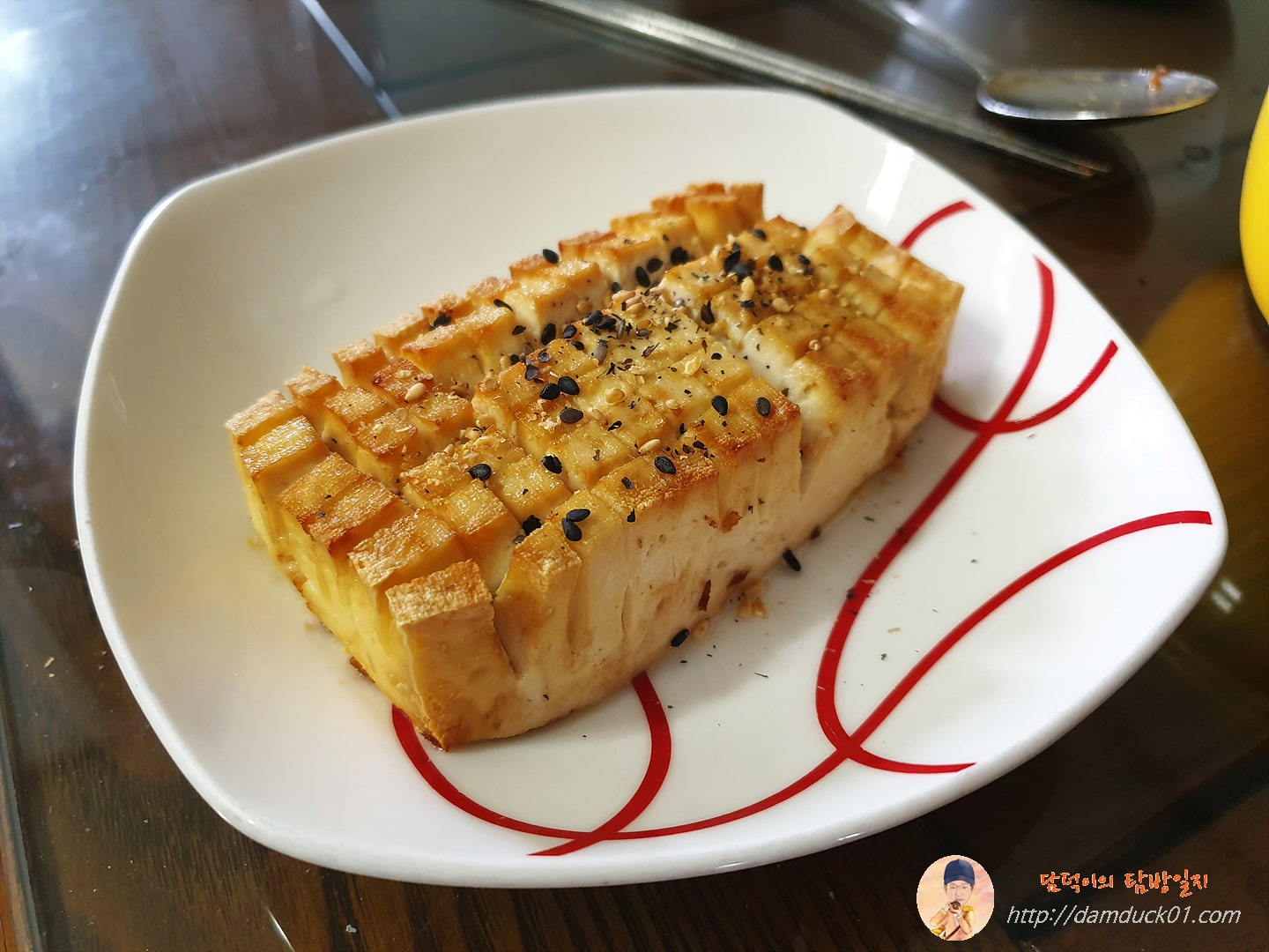 그리고 이건 아내가 만들어준 두부 요리인데 아내가 된장찌개 끓이고 남은 찌개용 두부에 칼집을 내고 그 위에 연두를 해주고 포도씨 오일 스프레이를 한 번 쏴준 후 200도로 20분을 돌려줬다고 합니다. 그렇게 조리가 끝난 두부 위에 깨로 마무리를 했죠. 전 두부 안 좋아하는데 이날 두부는 그래도 괜찮게 먹었습니다. 저 말고 가족들은 전부 두부를 좋아해서 정말 순식간에 사라진 요리였답니다.