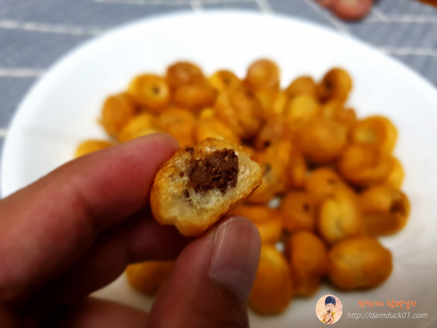 바스켓이 뜨거우니 이대로 아이들과 먹기에는 위험할 거 같아 접시 하나에 옮겨 담았습니다. 그리고 아이들에게 가지고 갔더니 "와~ 뭐야 뭐야 뭐야?"라고 하면서 달려드네요. 과연 어떤 맛일까? 궁금해하며 저도 하나를 집어 들었습니다. 원래 홈런볼은 약간 부드러운 느낌의 식감이잖아요. 그런데 이렇게 에어프라이어에 돌린 홈런볼은 바삭합니다. 수분기는 전혀 없는 씹으면 바스스~ 부서지는 느낌의 식감으로 변하고 안에 들어있는 초코가 그냥 먹는 것보다 더 진해진 느낌이 납니다. 초코가 살짝 녹은 걸까요? 초코의 맛이 진하고 살짝 녹은 느낌이 나는데 오~ 이거 괜찮네요. 홈런볼 과자의 식감은 호불호가 있을 거 같은데 초코맛이 진해진 건 호만 있을 거 같아요.