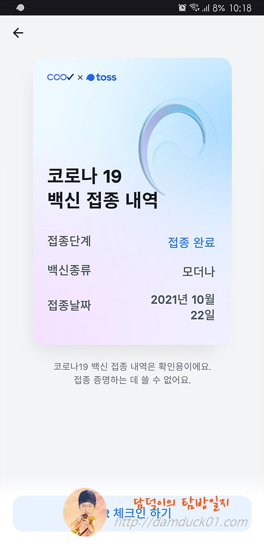 하~ 이 힘든 과정을 지나고 나서 얻은 건 이 접종 완료 표시, 이제 점심 먹을 때 QR 체크인하면 저도 "접종 완료입니다." 이런 메시지 들을 수 있겠네요.