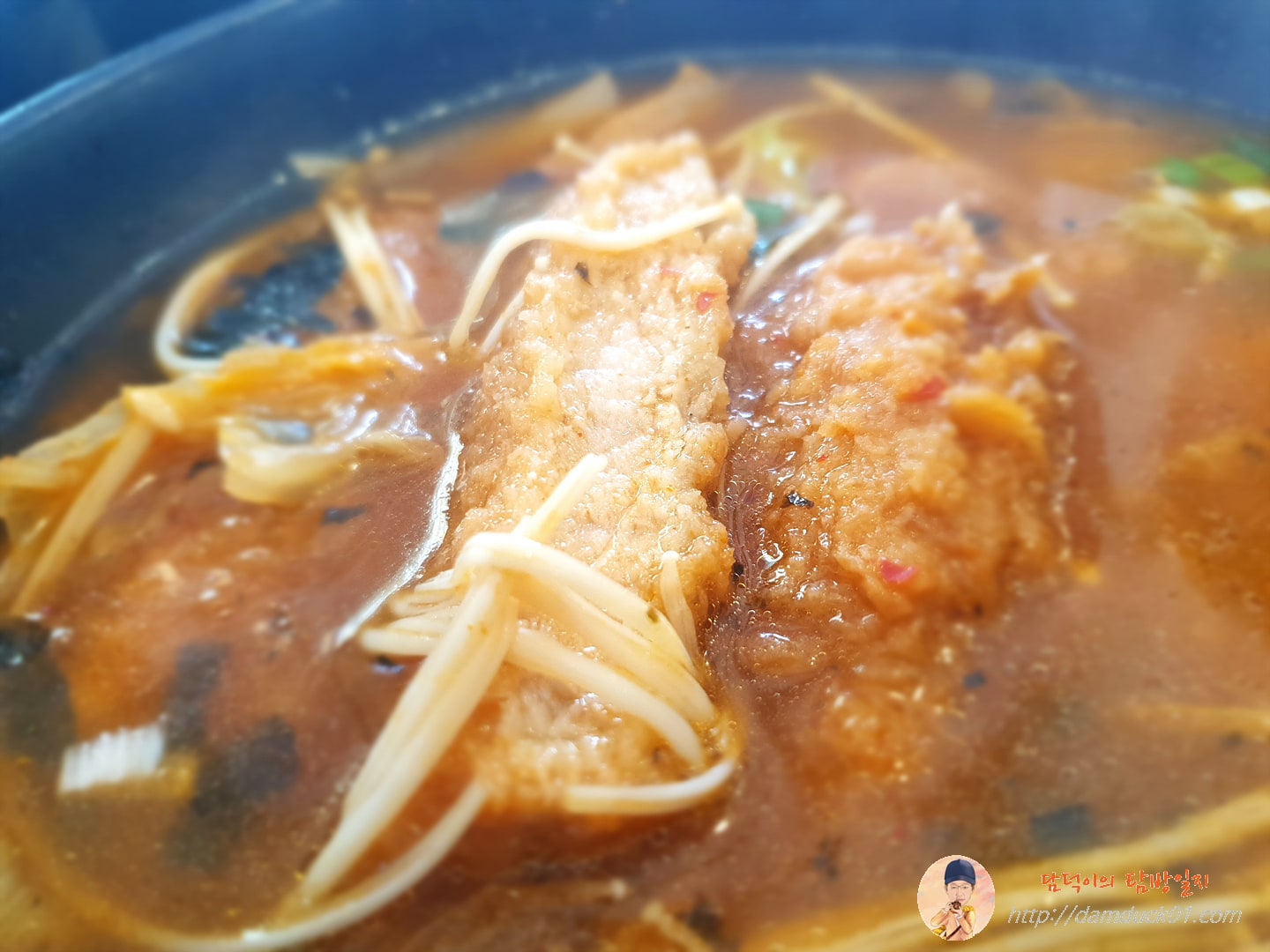 다른 곳에서 먹어본 돈가스 김치나베는 국물이 자박자박한 편이고 위에 얹어진 돈가스가 바로 보이는데 곰소바의 돈가스 김치나베는 국물이 많네요.