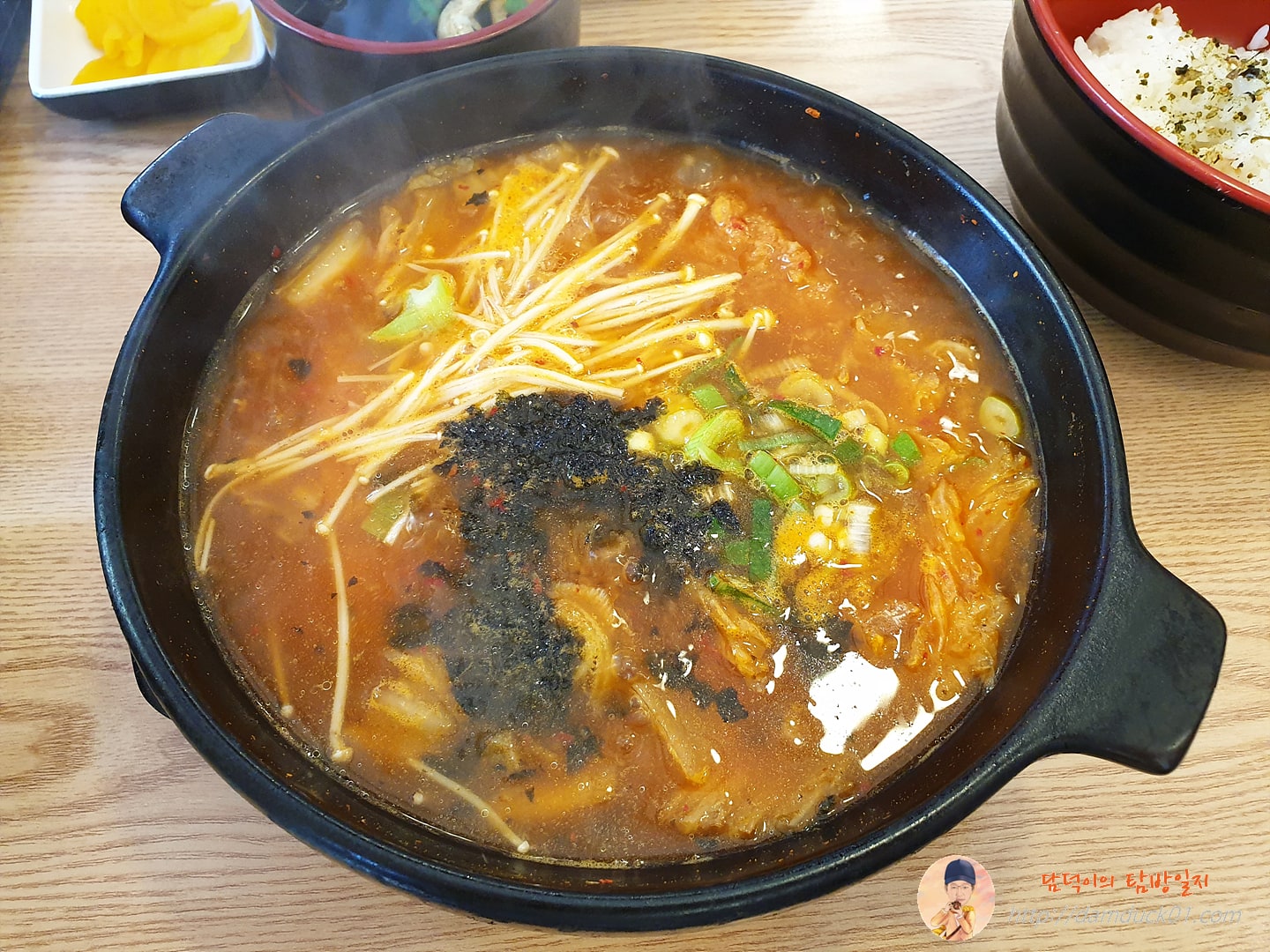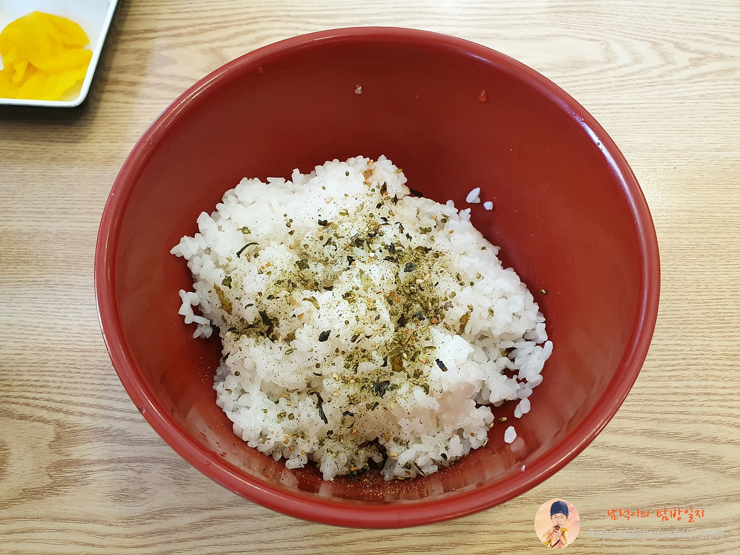 후리카케가 뿌려진 밥과 뜨겁게 달궈진 뚝배기에 돈가스 김치나베가 담겨 나왔어요.