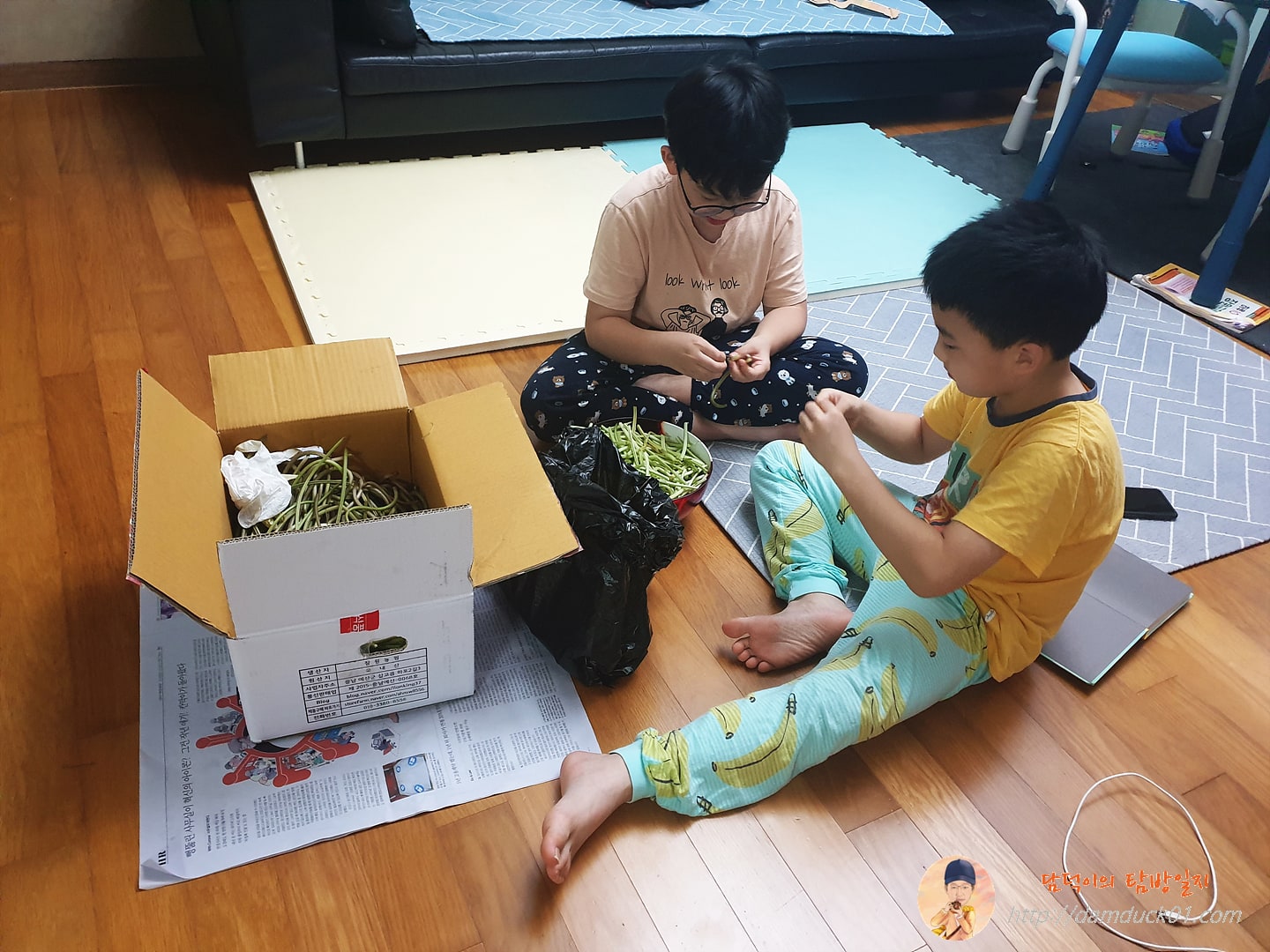 수요일부터 어제까지 퇴근을 하고 집에 들어가면 전에는 볼 수 없던 모습을 보고 있었답니다. 바로 하람이와 가람이가 고구마순 껍질 벗기는 모습이요.