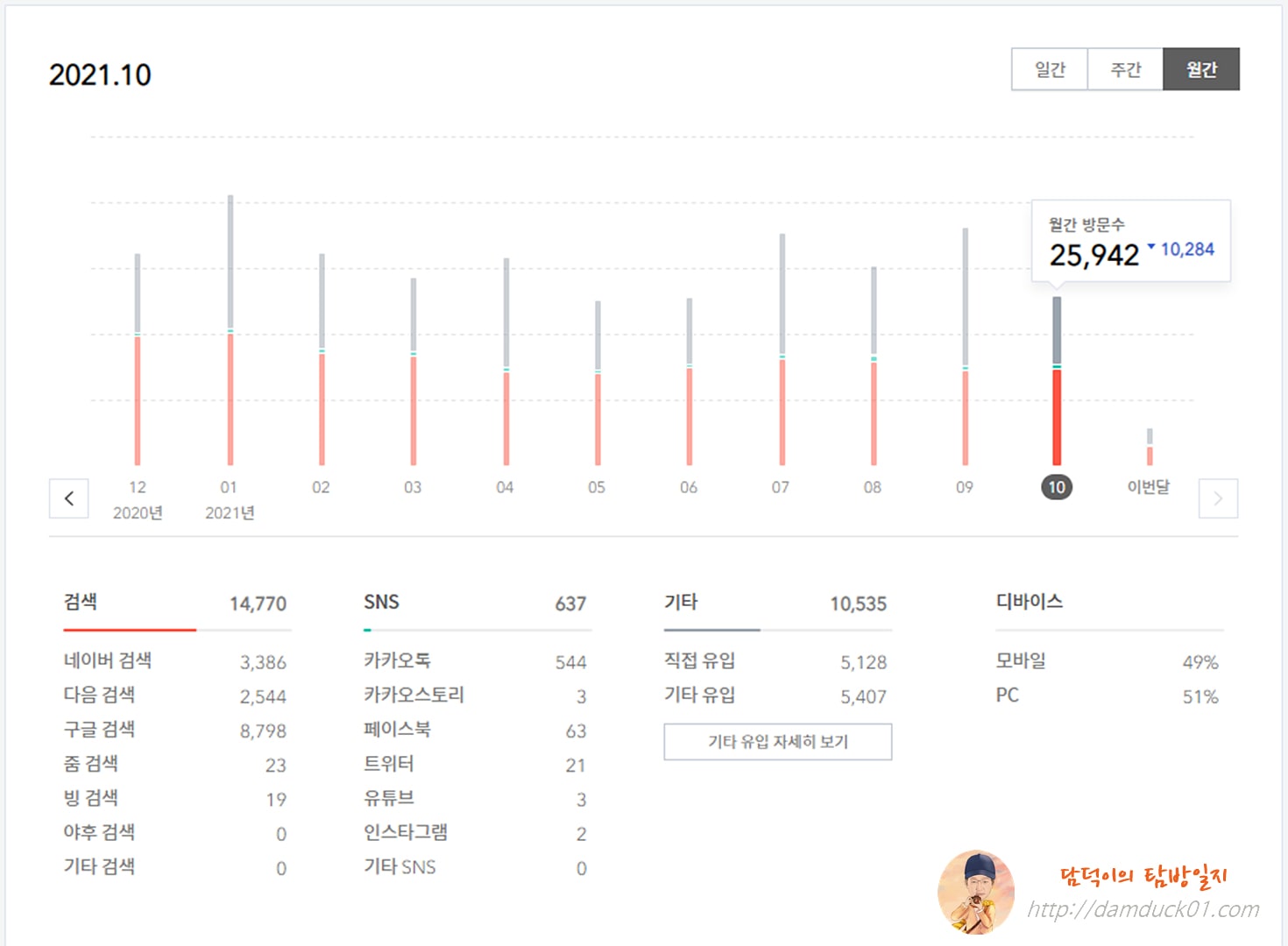 2021년 9월 월간 방문 수는 36,226을 기록 일 평균 방문 수 1,000을 넘긴 약 1,208을 기록했었는데 10월에는 무려 10,284가 하락한 25,942를 기록했어요. 일 평균 방문수가 800을 겨우 넘긴 816 정도가 나왔네요. 하~