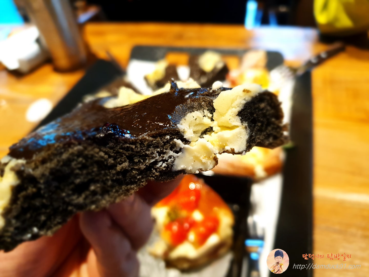 번개탄이 아니에요는 보는 것과는 다르게 속까지 촉촉한 식감에 크림치즈와의 조합도 너무 좋았고요.