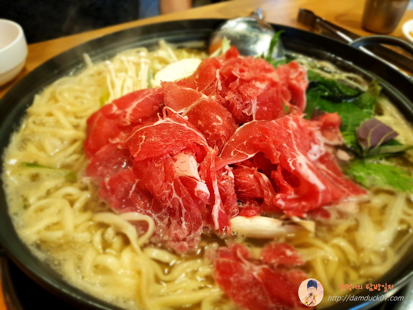 깻잎과 미나리, 버섯, 소고기와 면까지 푸짐하고 맛있어 보이는 맹심불고기의 소고기 버섯 국수전골이네요.