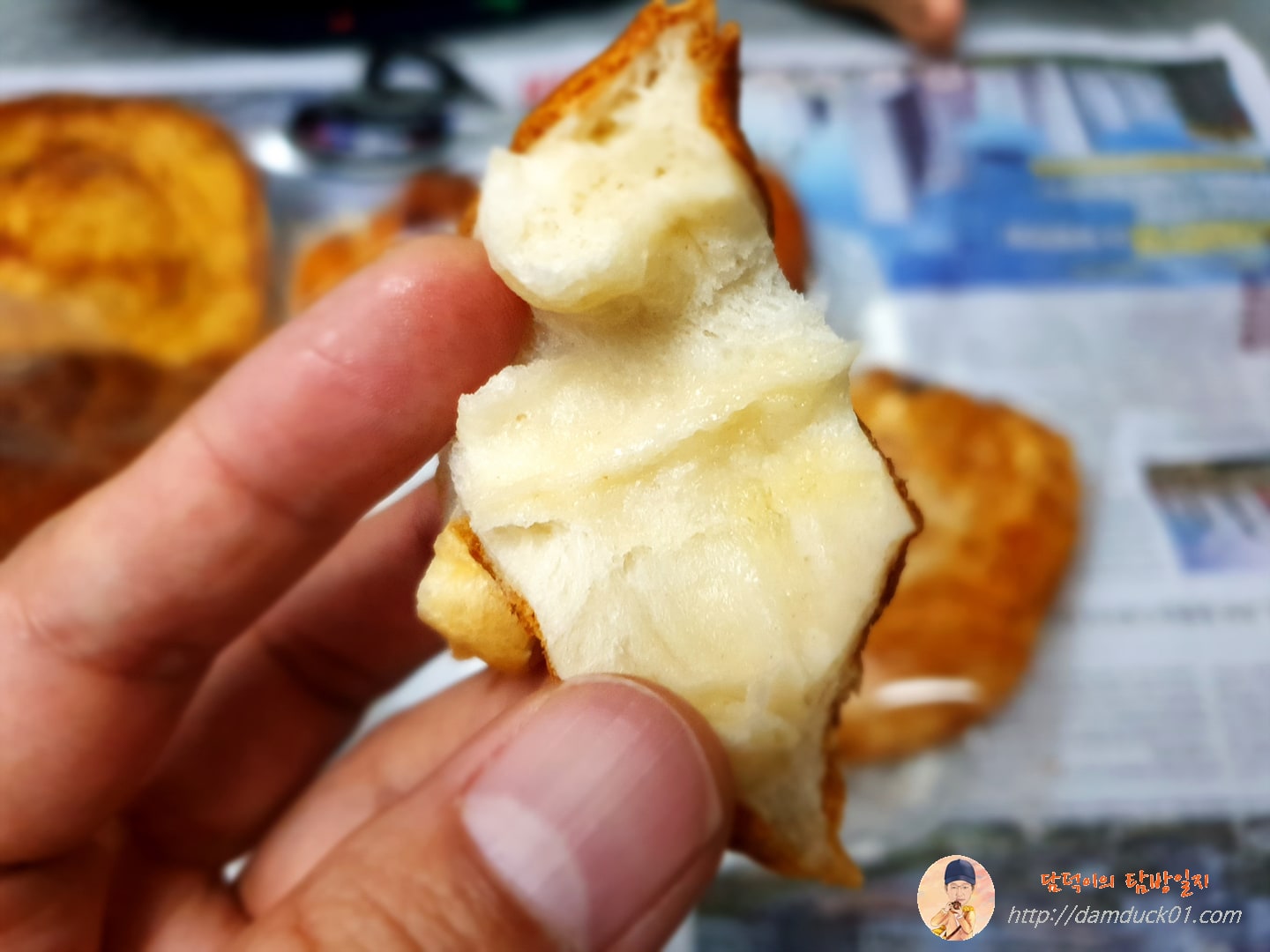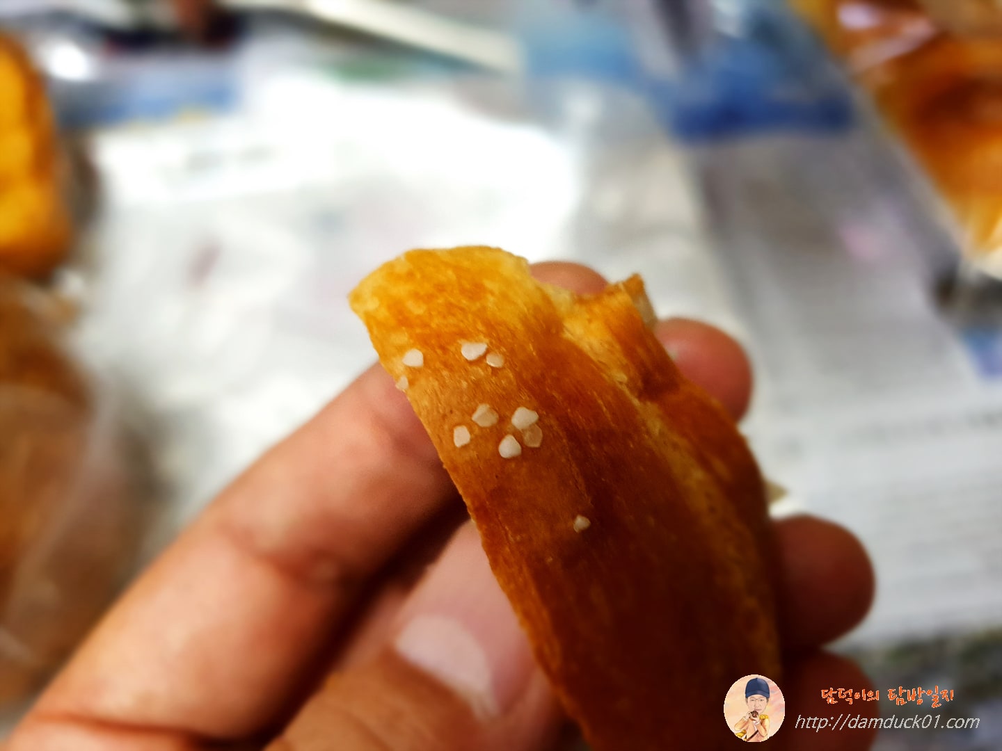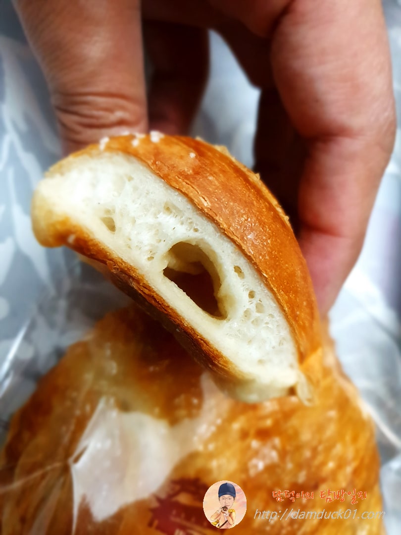 전 처음에 소금빵이라고 해서 빵 반죽에 소금을 넣고 전체적으로 짭짤한 맛이 나는 건가? 했는데 그건 아니고 빵 표면에 있는 거 흰 덩어리 보이시나요? 저게 소금이었어요. 그래서 저 부분을 먹으면 짠맛이 나는데 음~ 굳이 이걸 왜? 이런 생각이 들었어요. 속에는 버터가 들어서 부드러운 식감에 고소하기도 하고 괜찮은 빵이었거든요.
