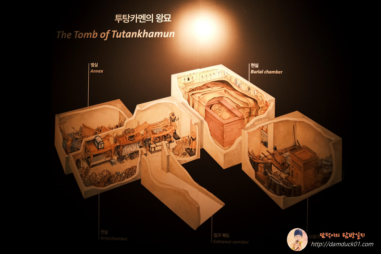 이렇게 왕묘를 구경하고 더 안으로 들어가면 이제는 본격적으로 발굴품들의 전시가 시작됩니다. 사당과 석관이 전시되어 있는데 저 사당 안 바닥에 있는 그림은 하워드 카터가 직접 그린 거라고 합니다. 하워드 카터는 각 사당 벽면의 위치뿐만 아니라 그 사이에 안치되어 있던 부장품들의 위치도 도면에 표기해 두었다고 하는데 이때 제가 아내한테 물어봤었거든요.