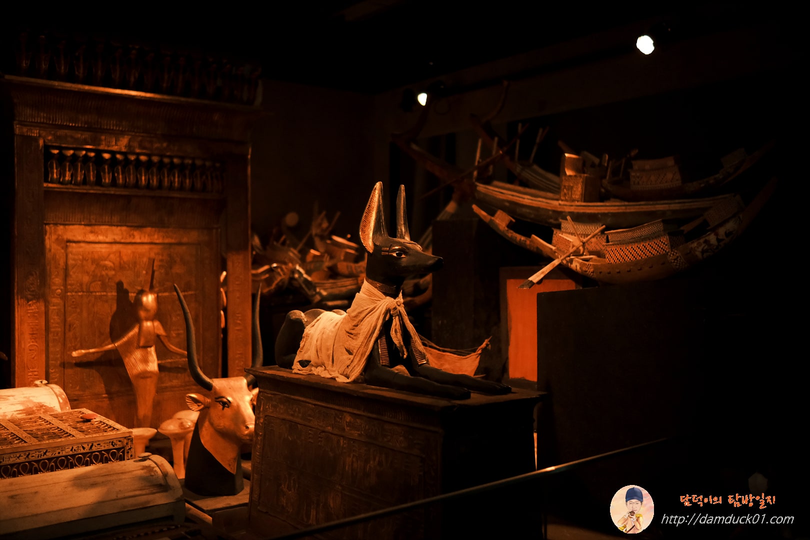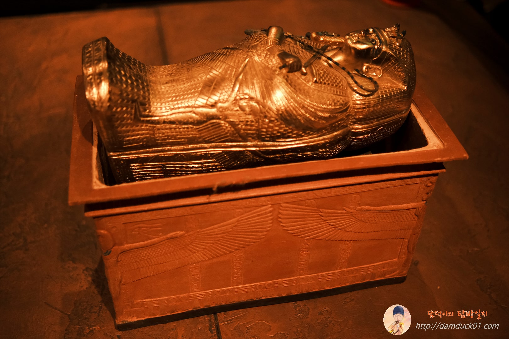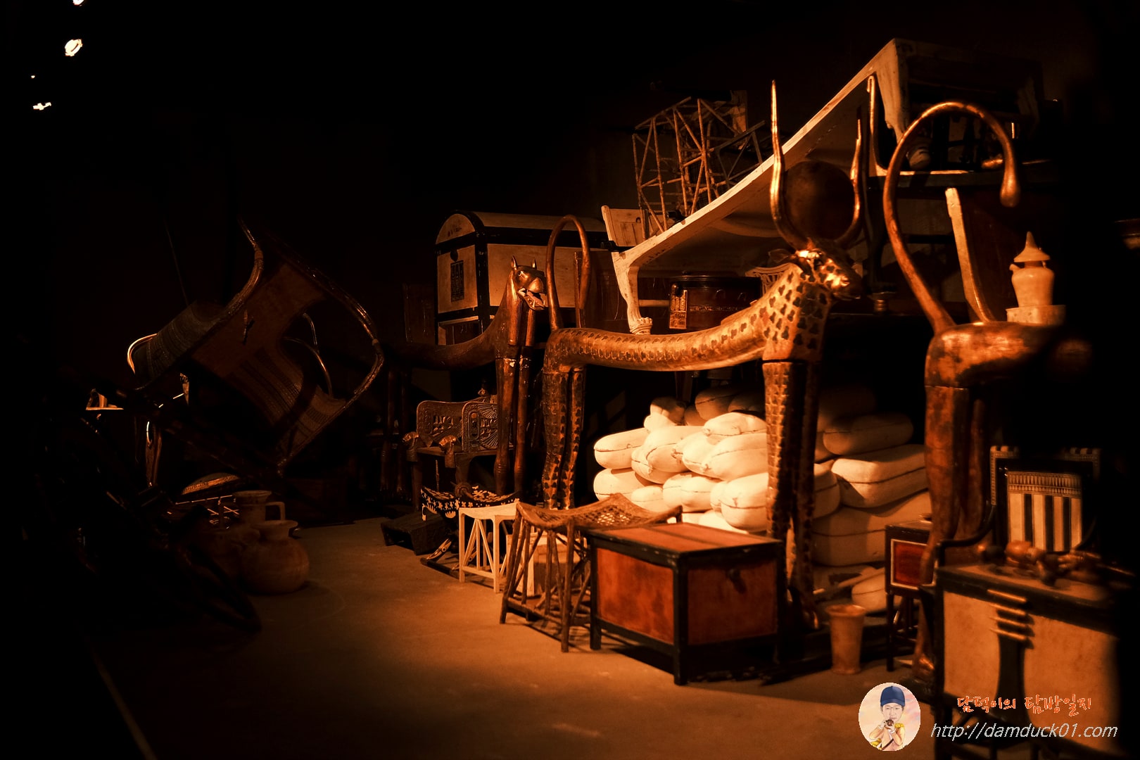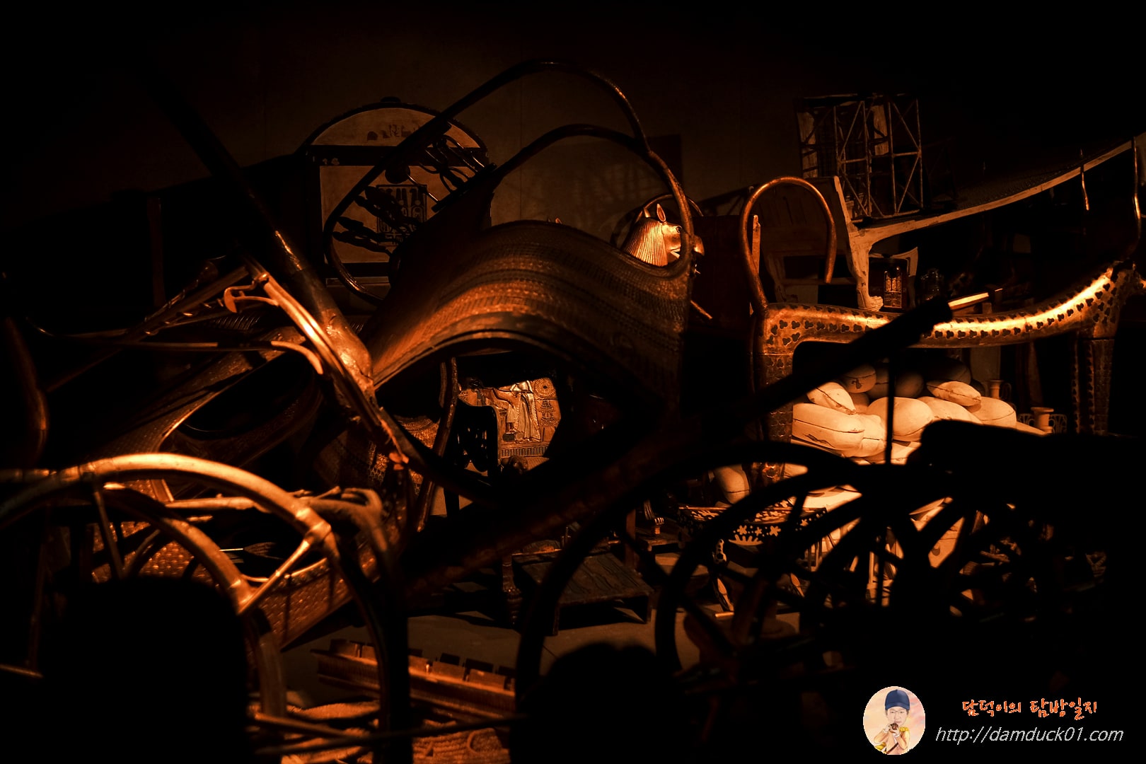 이렇게 사당과 석관 관람까지 마치고 나면 마지막 전시실로 들어가게 됩니다. 여기에는 투탕카멘의 황금관, 황금 가면 그리고 다양한 부장품들을 볼 수 있는데요. 설명을 들어보니 대부분 저 세상에서도 계속 살아가야 하는 태양의 신 이집트의 왕인 투탕카멘을 보호하기 위한 주술적이고 상징적인 것들이었어요.