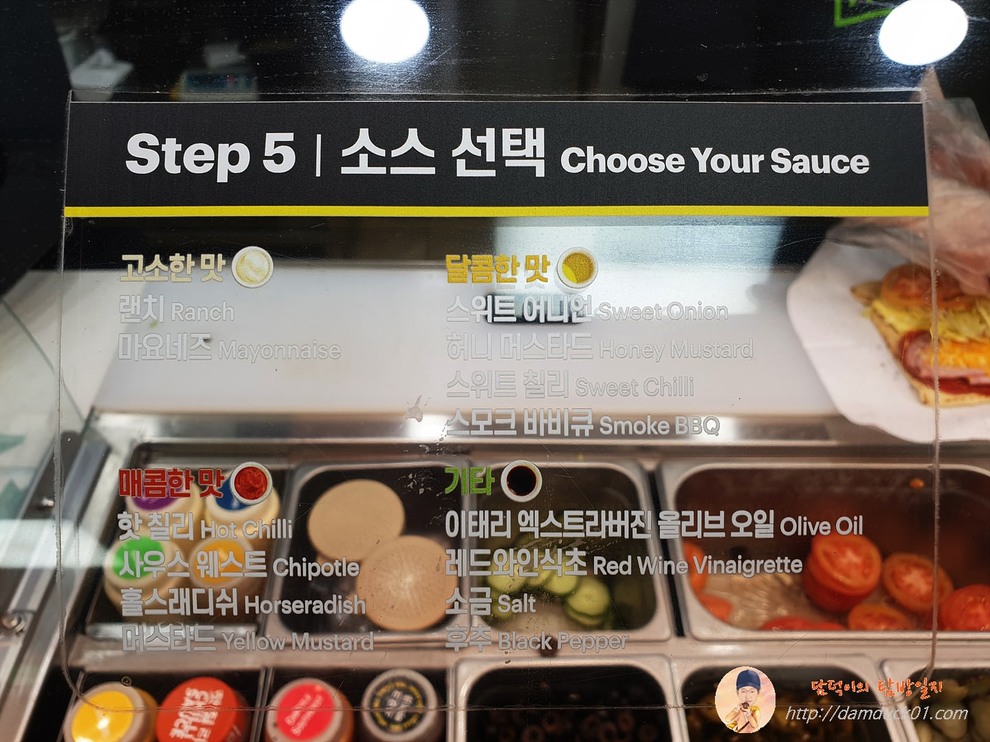 4단계 야채 선택은 선택한다기보다 주로 빼거나 추가하는 건데 저는 빼는 거 없이 추가하는 거 없이 그냥 다 달라고 했고 5단계 소스 선택에서는 고소한 맛 범주에 있는 랜치를 선택했어요.