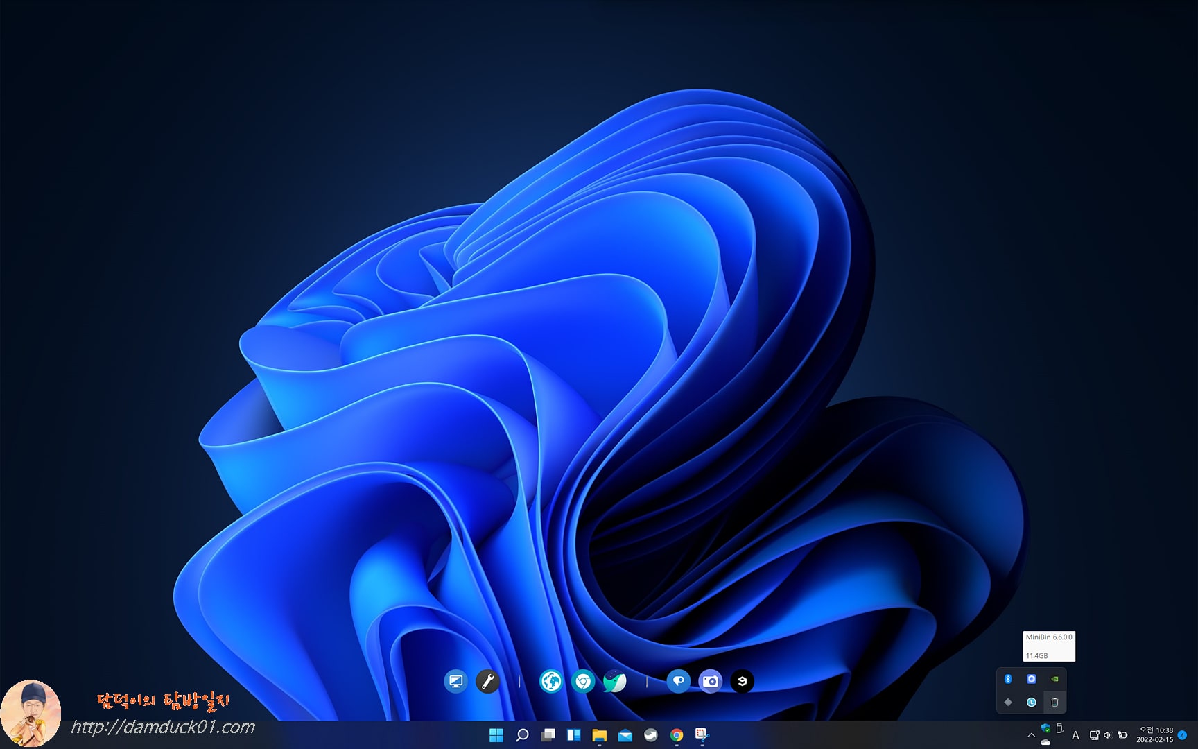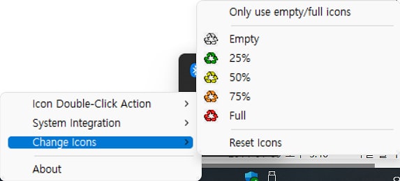 이렇게 작업표시줄에 휴지통이 25% 차 있는 아이콘이 생성된 걸 확인할 수 있습니다. MiniBin 아이콘에서 우측 마우스 버튼을 클릭해서 몇 가지 설정을 할 수도 있는데요. 아이콘을 더블 클릭해서 휴지통을 열거나 비우는 동작을 할 수 있는데 기본은 비우는 설정으로 되어 있으니까 원하는 기능으로 바꾸시면 되겠죠. 전 더블 클릭 시 휴지통을 열리도록 해 두었어요.