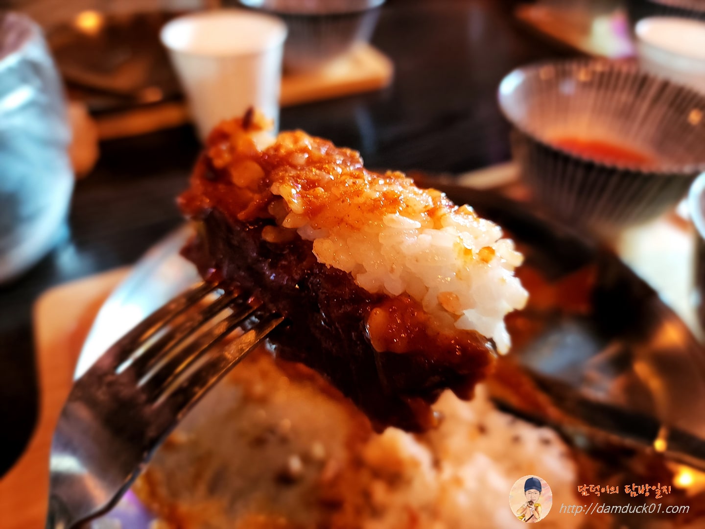 소스에 밥을 살짝 비벼 돈가스 위에 얹으면 돈가스 초밥 같은 느낌으로도 즐길 수 있답니다.