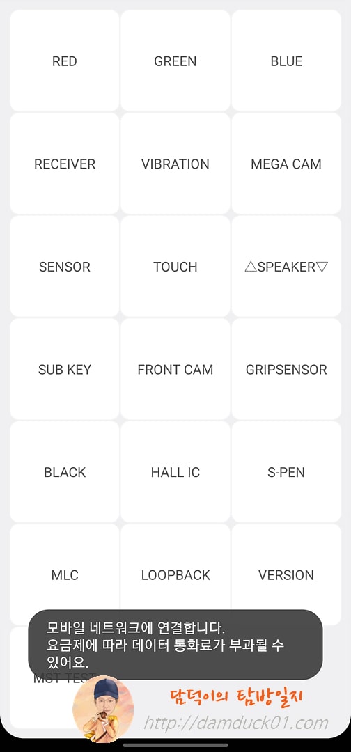 그럼 이렇게 멋은 없는 화면을 볼 수 있는데요. 여기에서 디스플레이의 불량화소부터 진동, 터치, 센서, 카메라, 스피커 등 다양한 테스트가 가능합니다.