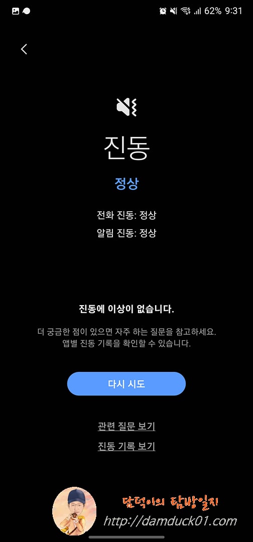그냥 테스트 항목을 터치하는 것 만으로 이렇게 상태를 확인하고 결과를 알려주기도 하고요. 진동 같은 경우는 사용자에게 진동 버튼을 진동을 울리고 사용자에게 진동이 제대로 울렸는지 확인받는 식으로 테스트를 진행합니다. 위에서 알려드린 갤럭시 테스트 모드보다는 훨씬 쉽게 테스트를 진행할 수 있는 기능인 거 같아요.