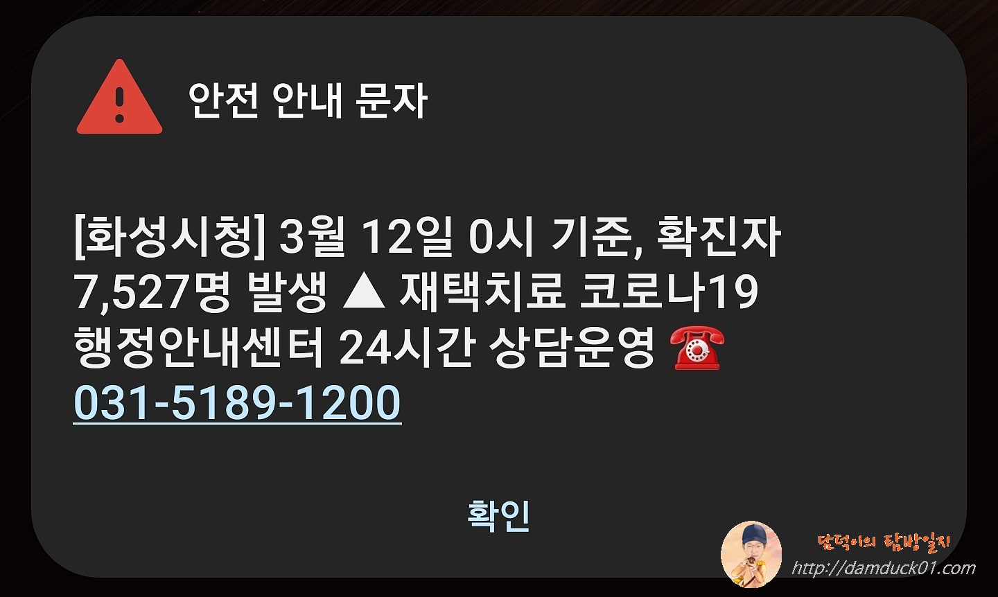 오늘 안전 안내 문자 온 거 보니까 3월 12일 0시 기준 화성시 확진자가 7,527명이라는데 그중 한 명이 저인 걸까요?