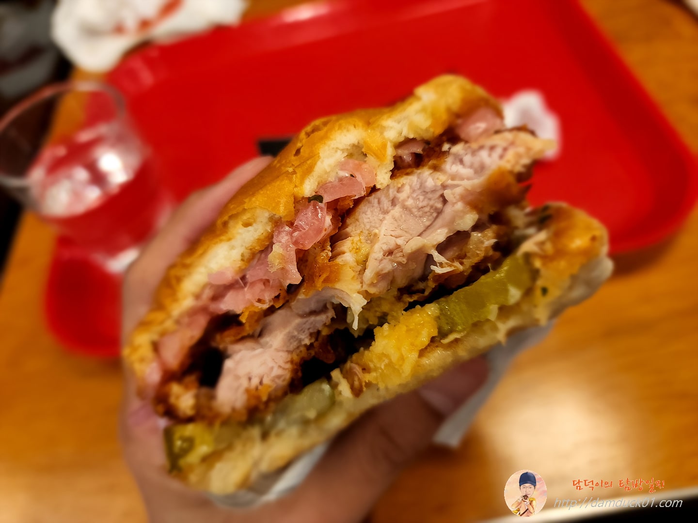 그냥 두툼하고 잘 튀겨진 치킨 패티인데 이 치킨 패티를 감싸고 있는 양파 피클과 오이 피클 구성이 아주 마음에 들었습니다.