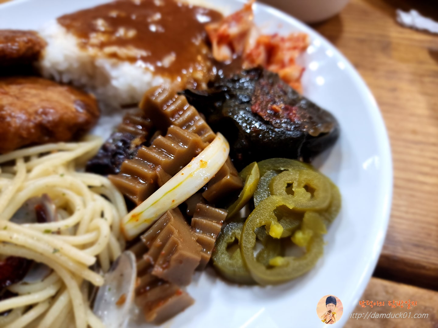 이것저것 먹고 싶은 만큼 담아 온 저의 점심 한 끼입니다. 밥 위에 하이라이스 살짝 뿌려주고 김치와 깻잎지, 할라피뇨 살포시 담아줬고요. 도토리묵도 담아 왔어요. 메인으로는 역시 함박 스테이크와 (파스타 이선균 버전으로) "봉~골레 하나!" 담아왔습니다. 그리고 늘 그렇듯 전 국을 포기하고 잔치국수 챙겨 왔어요.