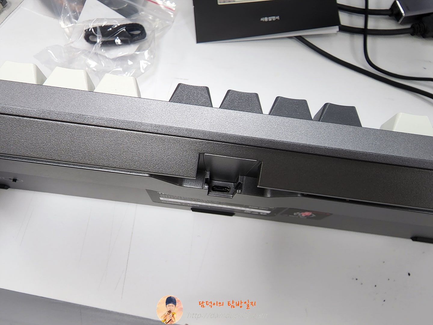 유선으로 사용하기 위한 케이블 단자는 이렇게 적용되어 있는데요. 이 제품이 휴대성이 좋은 제품도 아니고 애초에 휴대하고 다니는 게 목적인 제품도 아니라 유선으로 사용할 경우 자주 케이블을 뺐다 꼈다 하지는 않을 거 같지만 위치가 케이블을 끼고 빼는 게 편하지는 않게 생겼습니다. 가성비가 좋다고 하기에는 높은 가격이 단점이라는 생각이지만 체리 스위치가 적용된 텐키리스 키보드라는 점과 호환성 높은 2가지 타입의 케이블을 제공하고 블루투스 2개와 2.4 GHz 무선 리시버에 유선 연결까지 다양한 연결 방식을 지원하는 점등은 장점이라고 생각합니다.