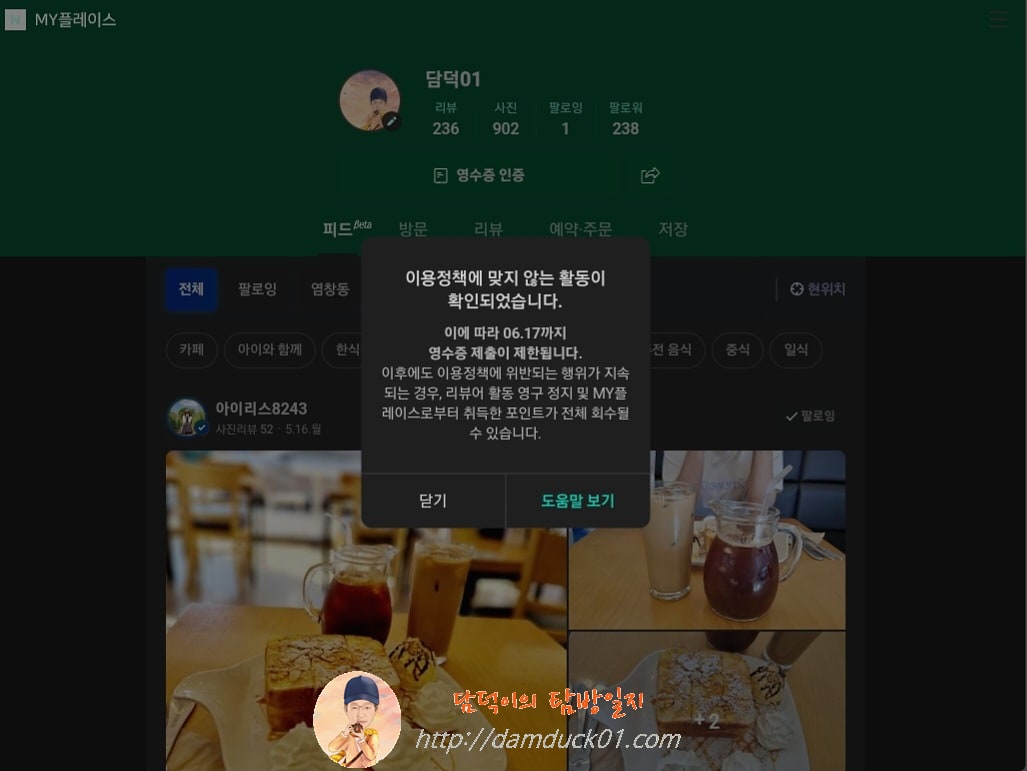 고객님 계정으로는 MY플레이스 이용정책에 명시된 금지 행위가 확인되어 서비스 이용이 제한되었습니다.