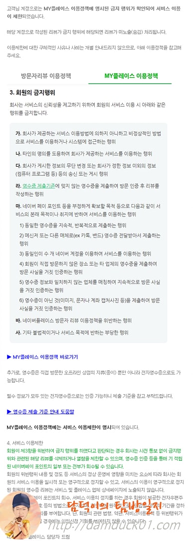 고객님 계정으로는 MY플레이스 이용정책에 명시된 금지 행위가 확인되어 서비스 이용이 제한되었습니다.