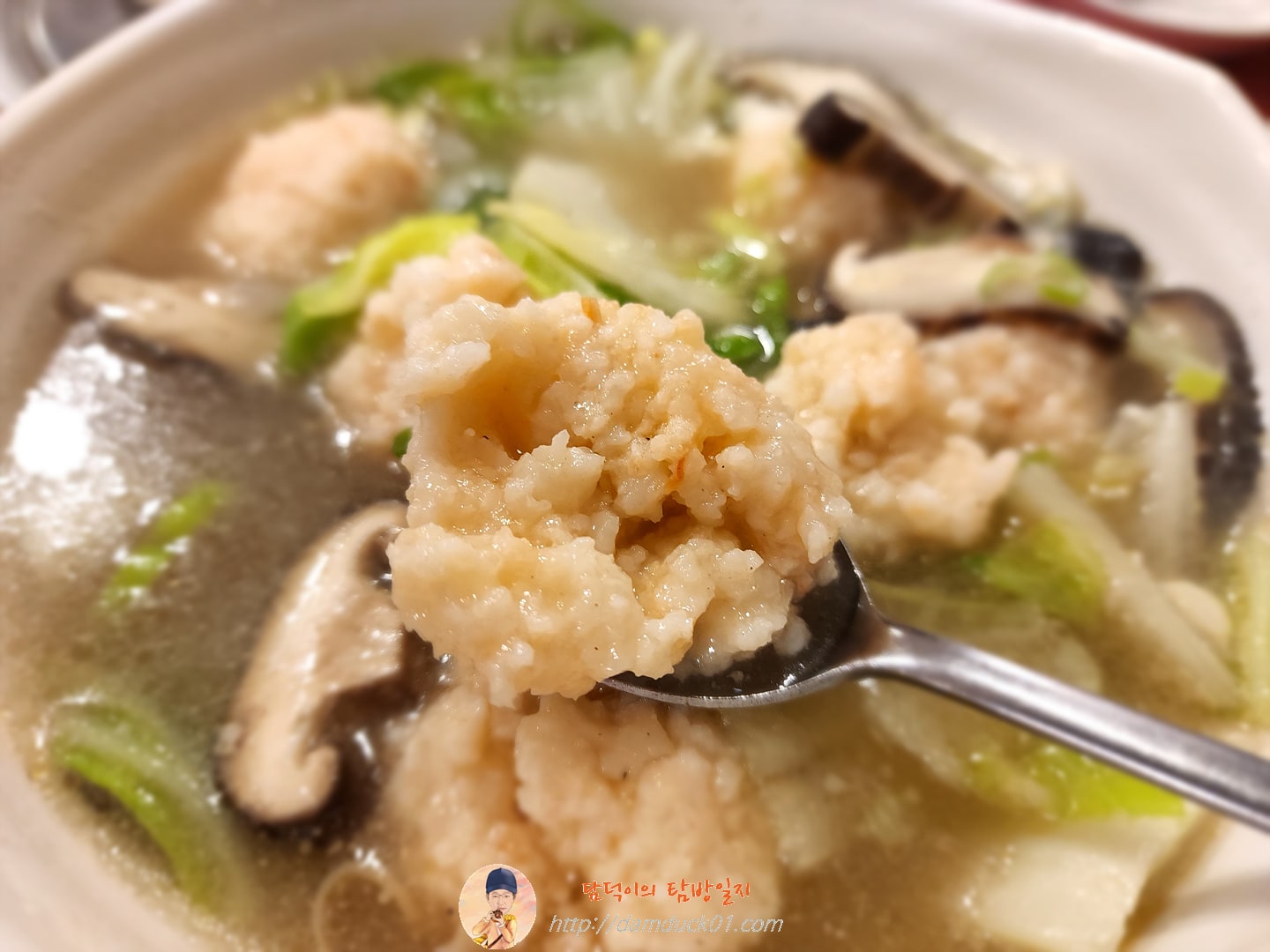 버섯 하나 먹고 완자 잘라서 먹고 국물 한 모금!